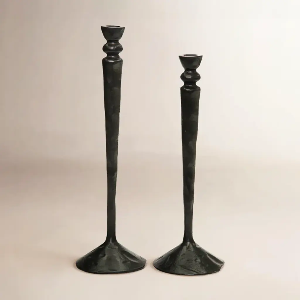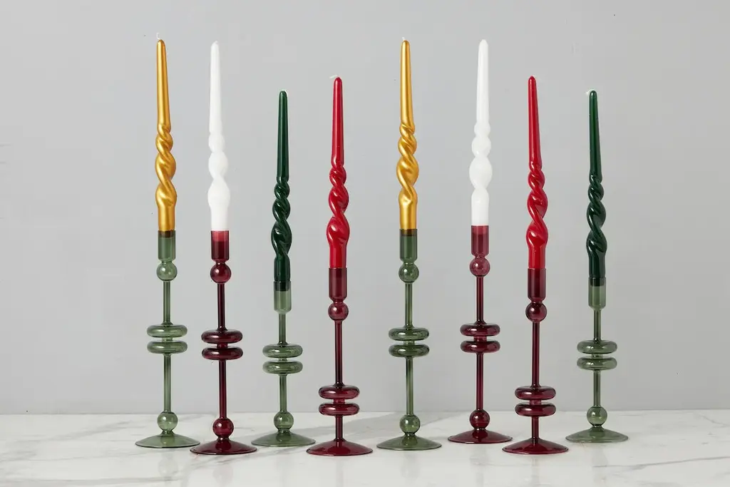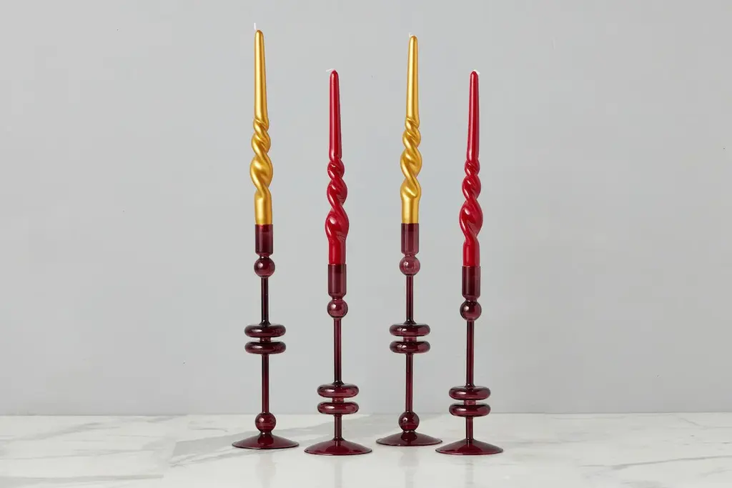 Elevate your home decor with a pair of Merlot Glass Candlesticks. These expertly crafted taper candle holders add a touch of timeless elegance to any room. Available in three sizes and colors, they are perfect for adding a pop of color to your dinner party or creating a statement throughout your home. Mix and match the sizes and colors to create a memorable tablescape. This is a pair of 2 small candlesticks. These candlesticks pair perfectly with our Twisted Taper Candles. Hand wash only. Never use sharp objects to remove hardened wax drips.