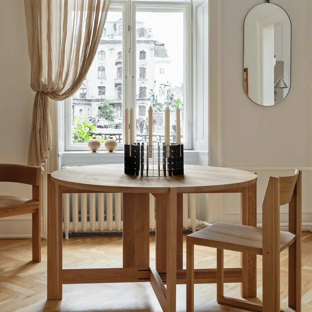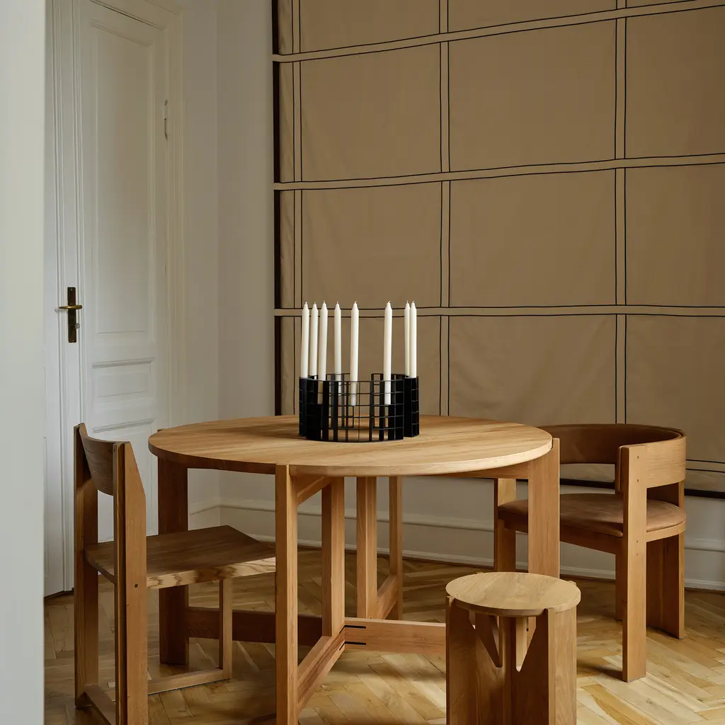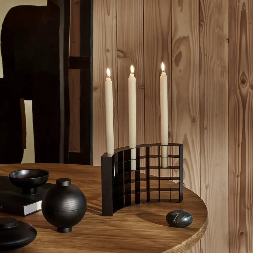 Equally striking with or without candles, the Kristina Dam Studio Mesh Candle Holder references the clean geometries of brutalism. At the same time, the design gives a nod to the studio’s stylish Grid sideboards. Formed with a symmetrical mesh pattern, this modern candle holder has a curved silhouette to maximize its visual impact and accentuate the contrast between shadow and light, while also reminding of brutalist architecture. Three spikes placed underneath circular openings allow you to bring Mesh to life with taper candles in white or colored wax. Crafted from steel, the Kristina Dam Studio Mesh Candle Holder features a durable powder-coated finish that is both tougher than standard paint and easier to clean. Use this candle holder on its own or place it in the vicinity of the Grid sideboard or cabinets, also available in our store, to create a beautifully coordinated room décor.