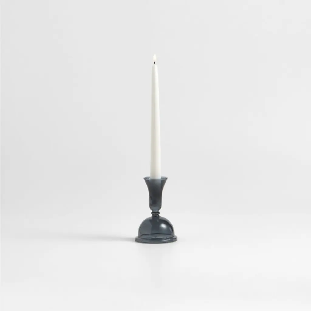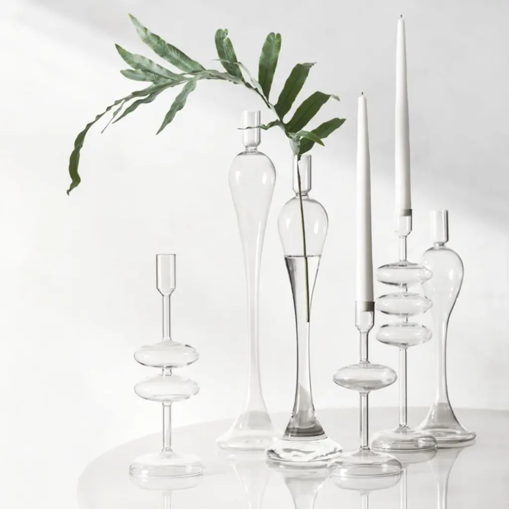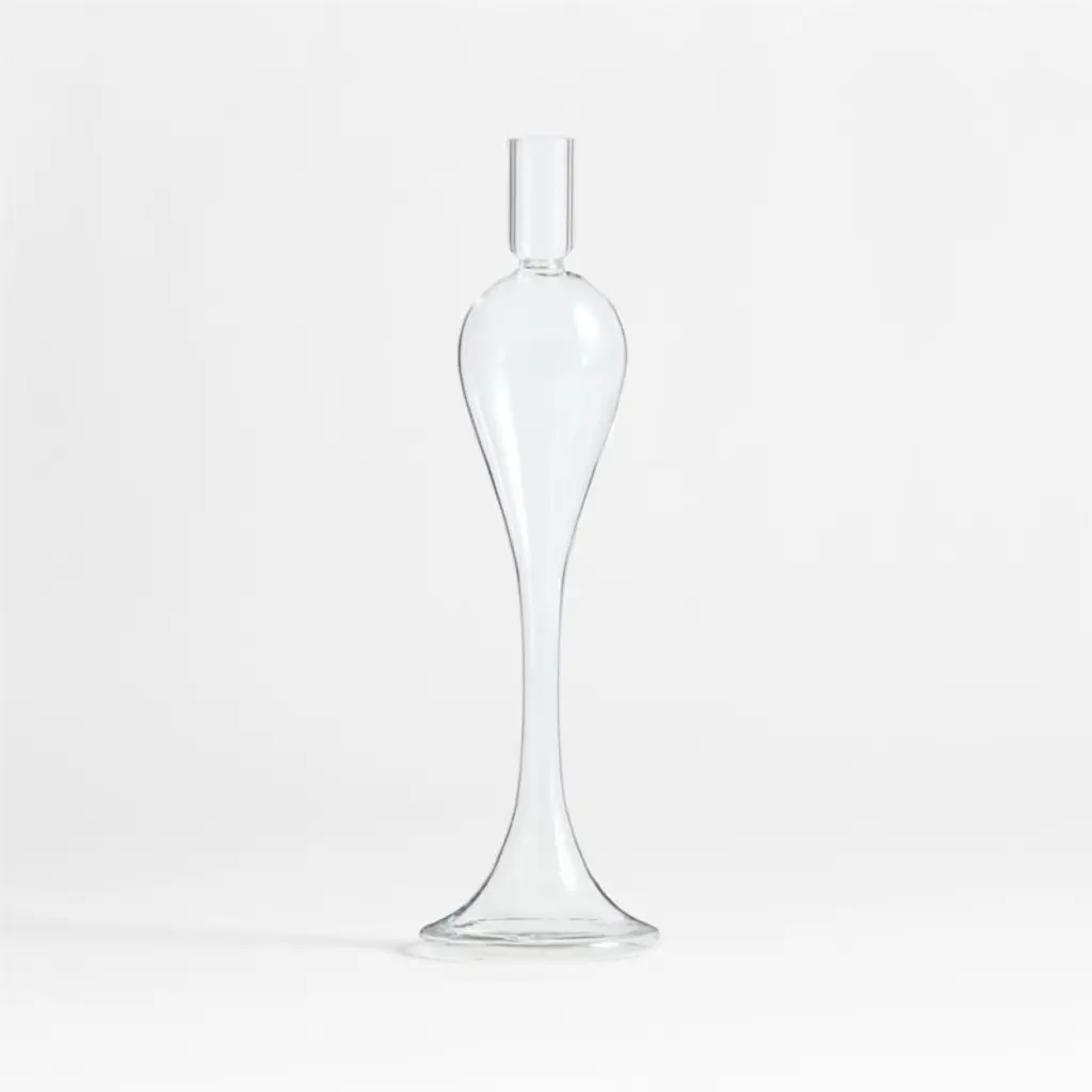 Milano reimagines classic candlesticks in clear glass, streamlining the ornate curves to stunning effect. Hand-blown by skilled craftspeople, this tall candle holder culminates in an elongated cup that supports a taper or double as a bud vase. Display the sophisticated piece solo for a sculptural look, or layer with other exclusive Milano glass taper holders in various heights for a more extravagant effect. Due to artisanal crafting, each small candlestick is beautifully unique.