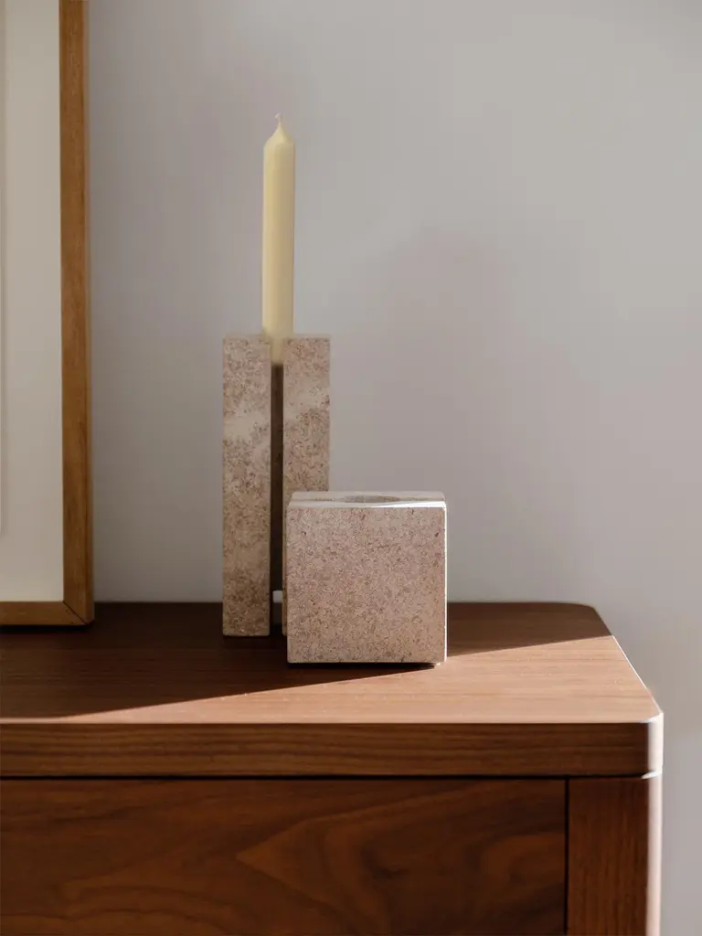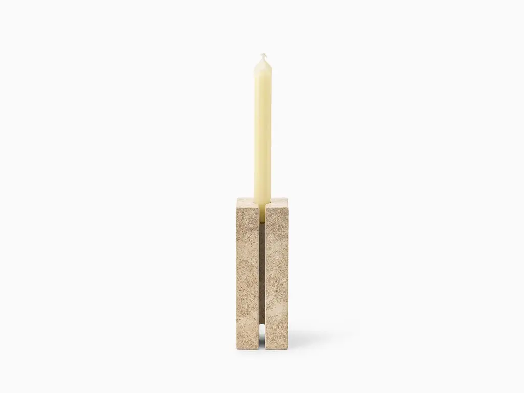 LEVE candleholders, a creation by the renowned designer Birgitte Due Madsen, are inspired not only by her former work centered around geometry and abstract sculptural fragments, but also the old Italian masters like Tobia Scarpa, futuristic architecture and brutalism. The designer scaled her sculptures to smaller pieces and gave them direct function and purpose, seeing them as fragments that can be pulled apart. LEVE candleholders are available in three sizes – for tealights, pillar candles and block candles, and are carved from marble with natural color variations, making each candle holder unique.