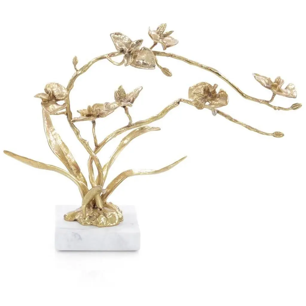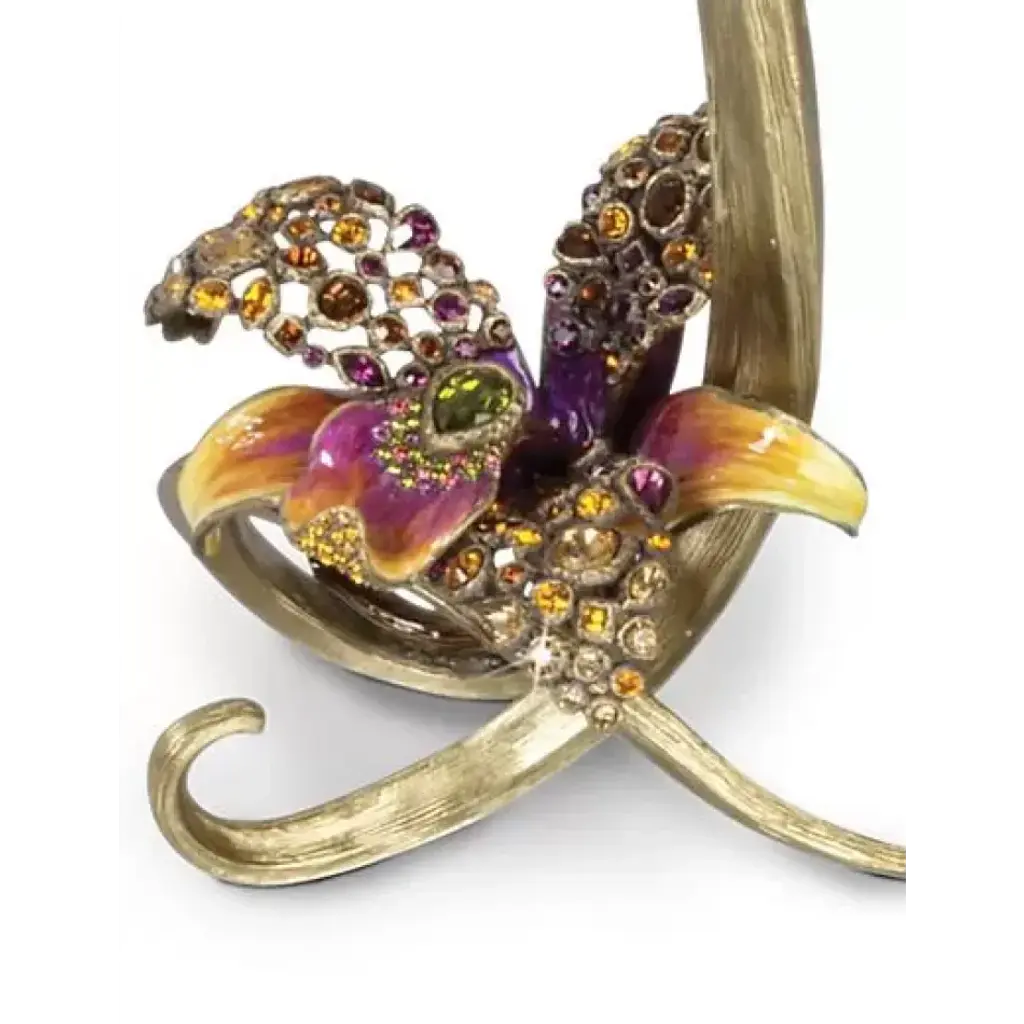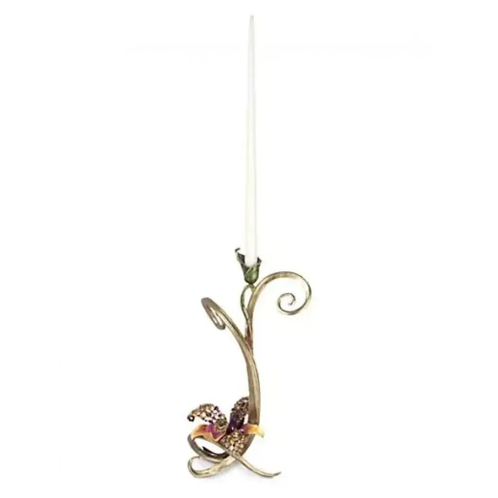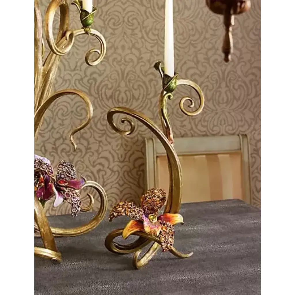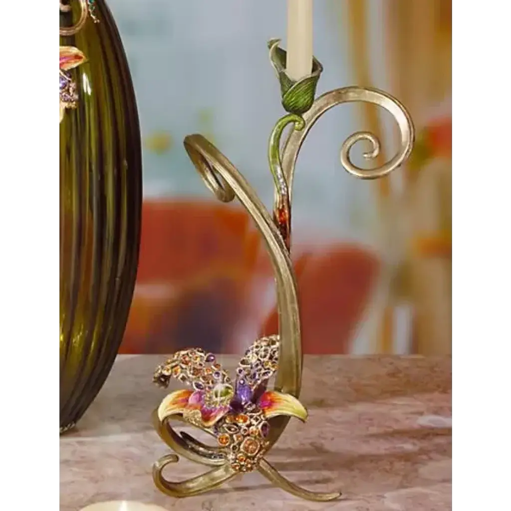 A striking contour of nouveau-style scrolled brass rises from the table, holding leaf-shaped candle cups. At the base of our Mirabelle Orchid Single Candlestick, lush orchids are fully bloomed in hothouse-toned enamels and set with vibrant faceted crystals and stones. Beautiful displayed as a pair or individually.