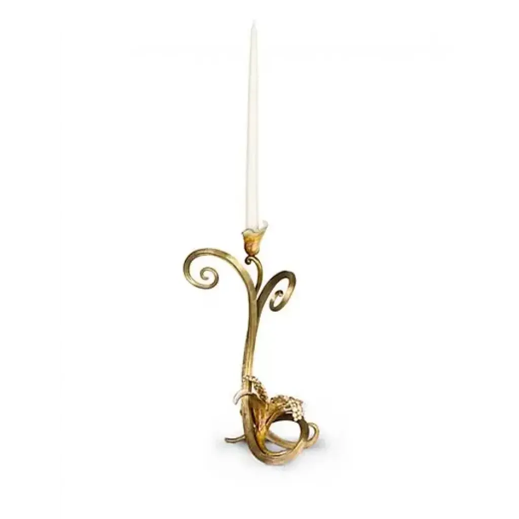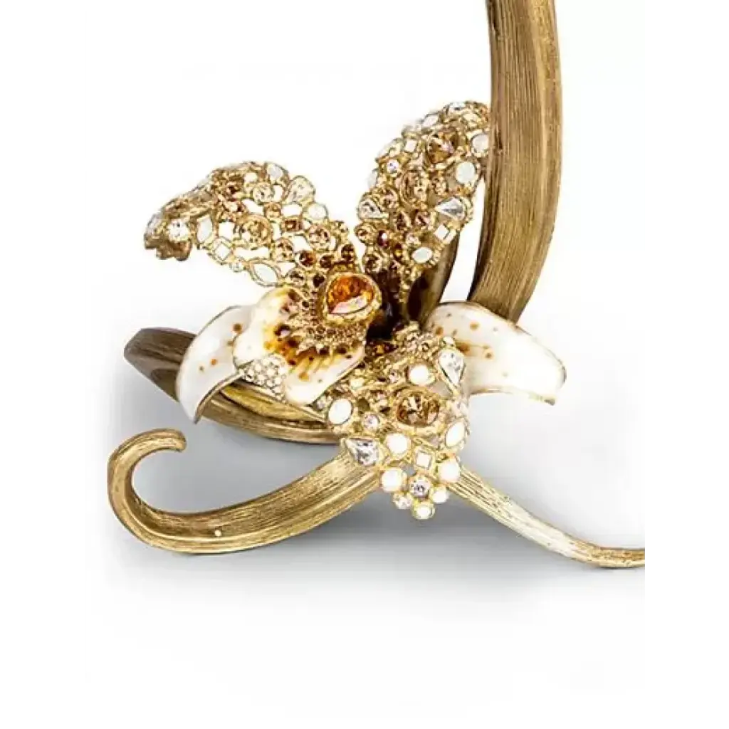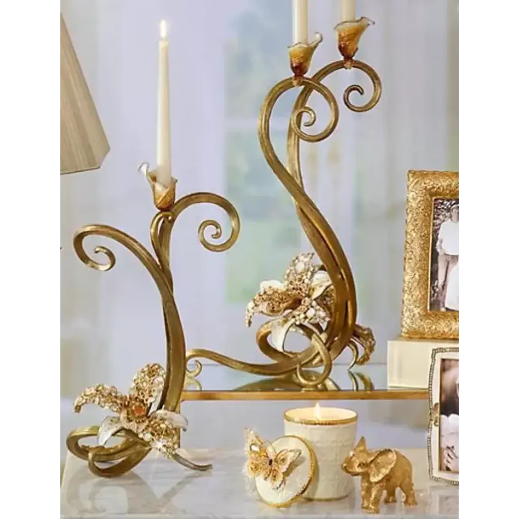 Swooping hammered brass scrolls dramatically lift taper candles above oversized, jeweled orchids at the base of our Mirabelle Orchid Single Candlestick. Brass crafted in India, with hand-enameled and jeweled flowers from Rhode Island.