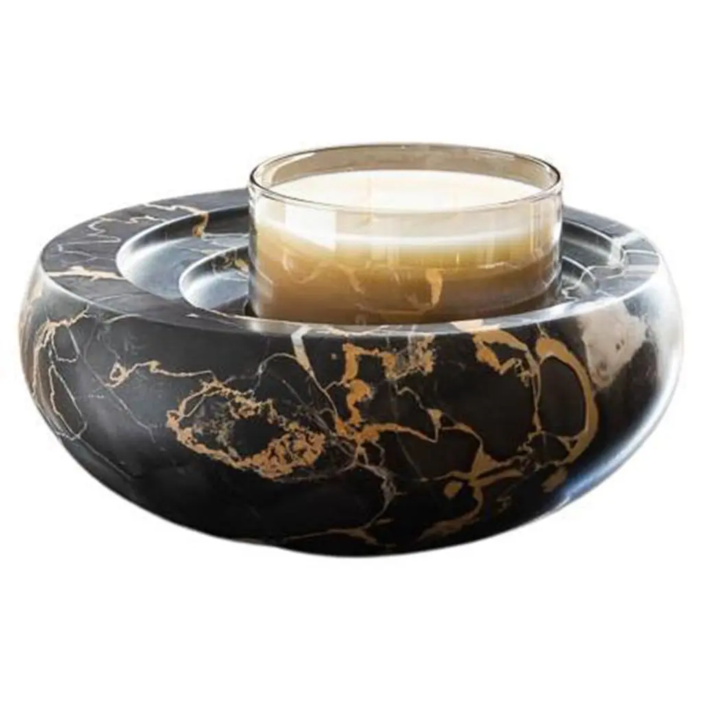 Inspired by monk temple candle holders, this black aluminum cove candle holder is finished on the inside in gold leaf to foster the illumination and light the way.