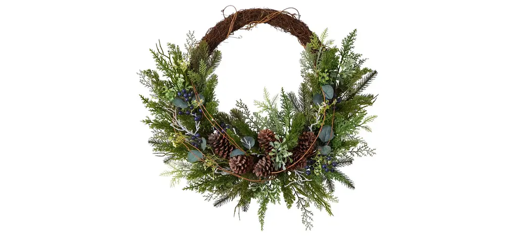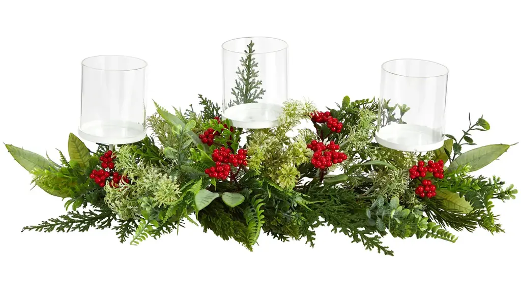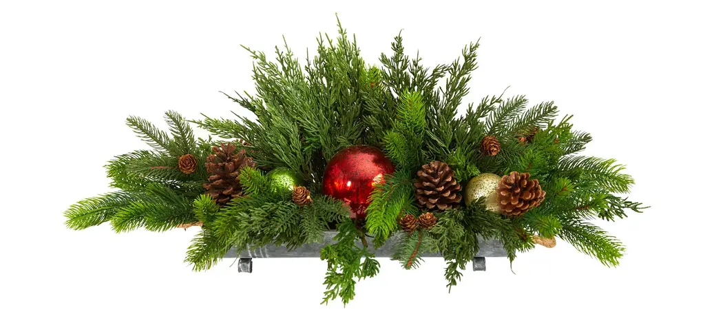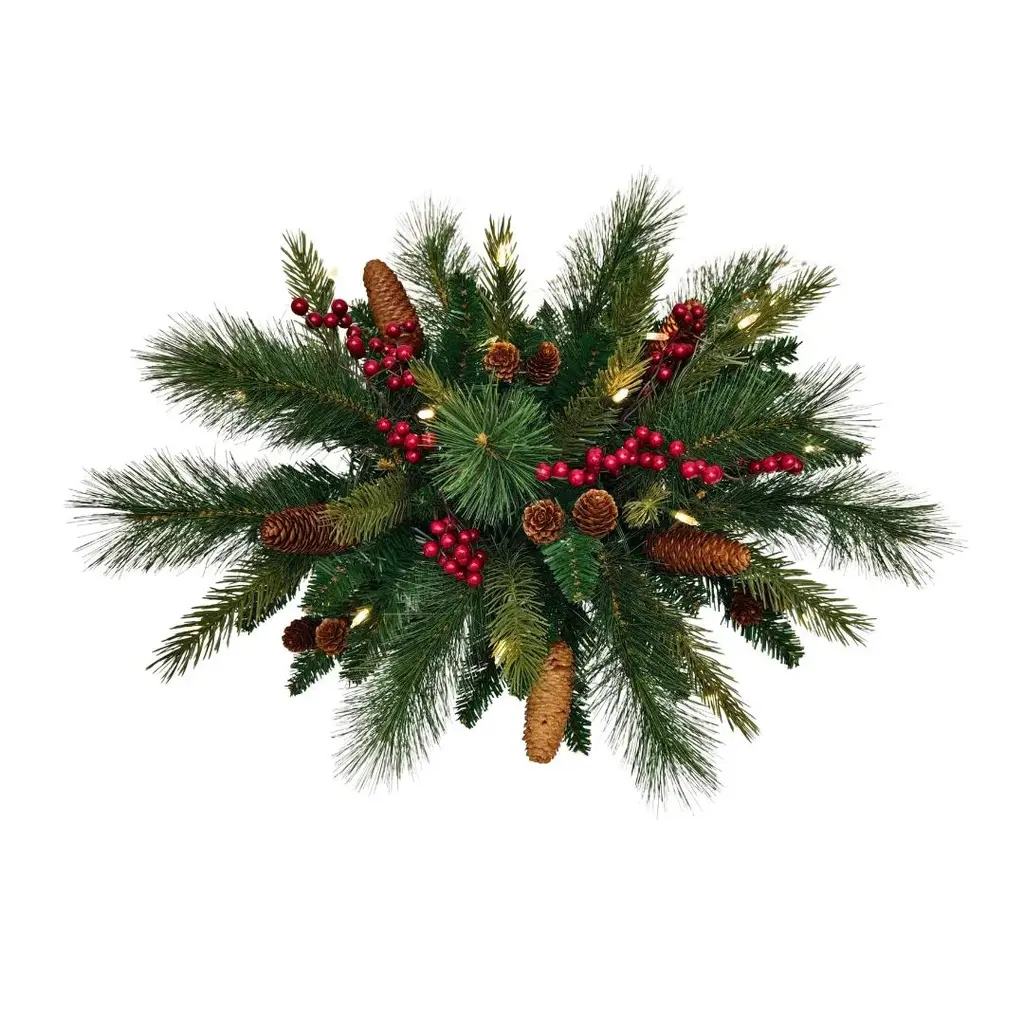 Bring the beauty of nature into your home with the Mixed Pine Juniper Candle Holder. This centerpiece features earthy green and brown tones, with a mix of pine, juniper berries, and pinecone accents that create a rustic, woodland charm. The discreet black metal base supports a central candle holder. Ideal for adding a festive touch to your holiday table, mantel, or entryway, this centerpiece creates a warm, inviting ambiance throughout the season.
