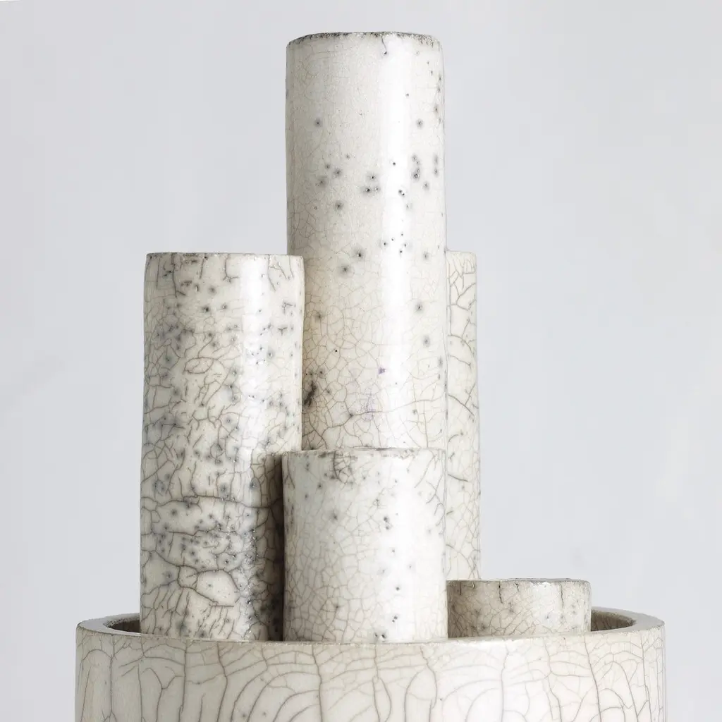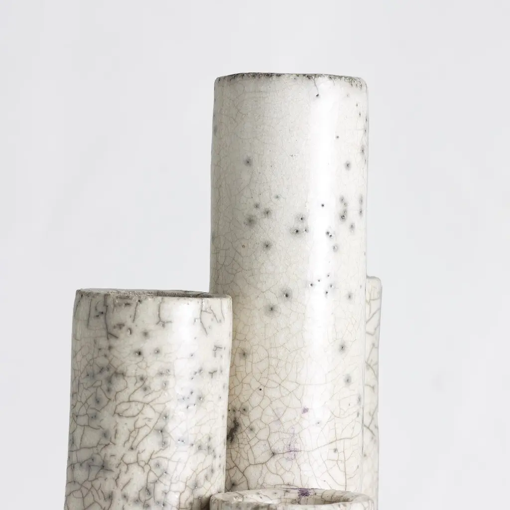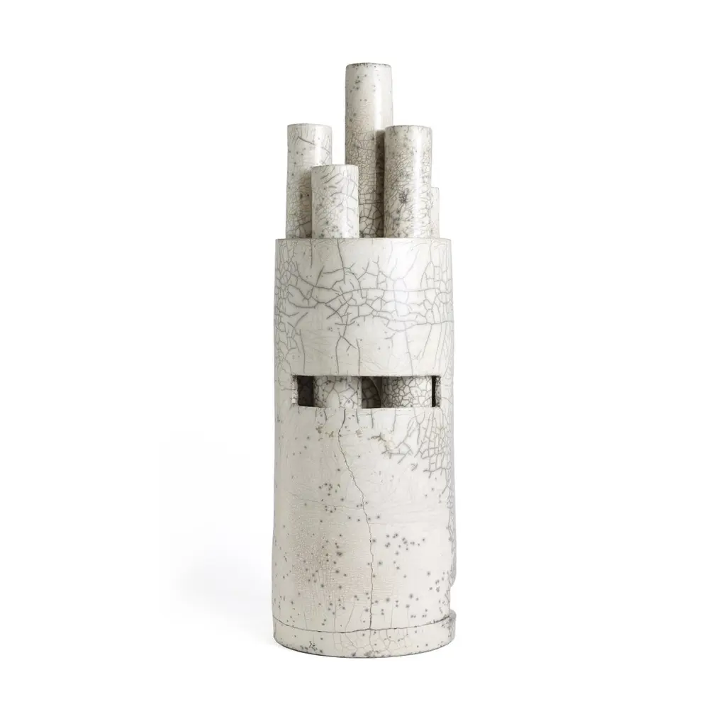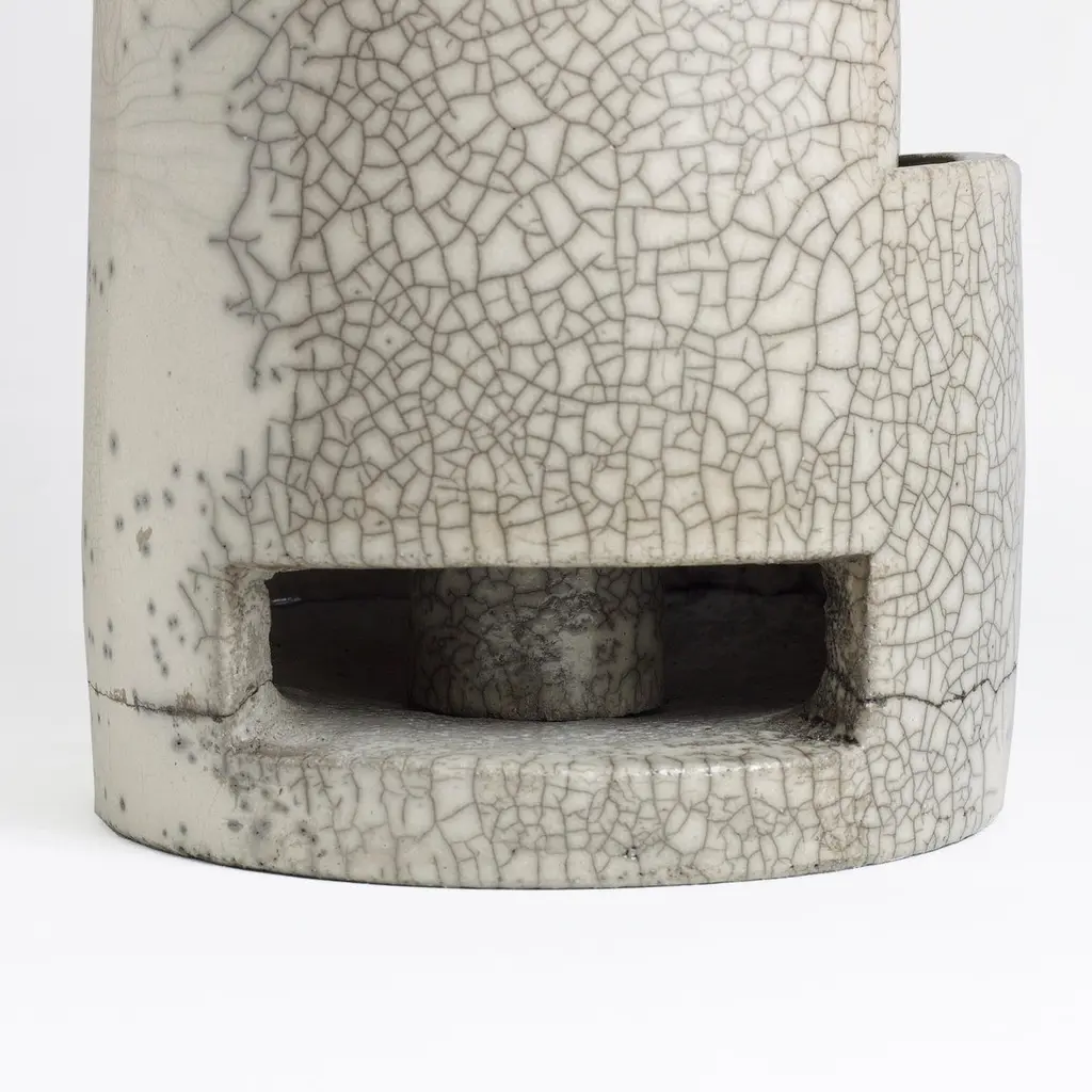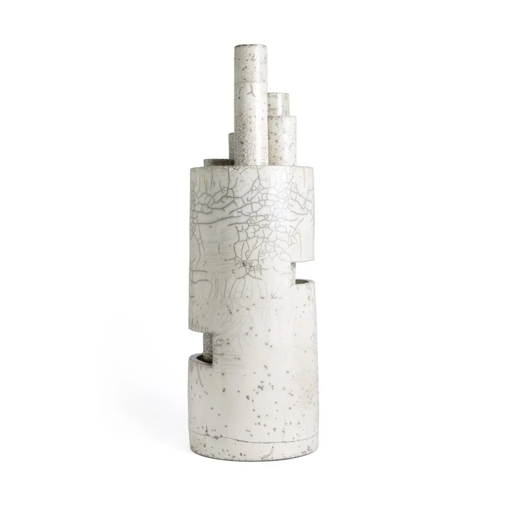 Modern Metropolis L Candle Holder Sculpture Raku Ceramic White Crakle