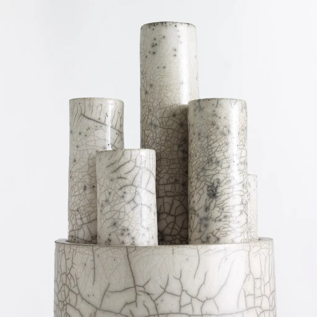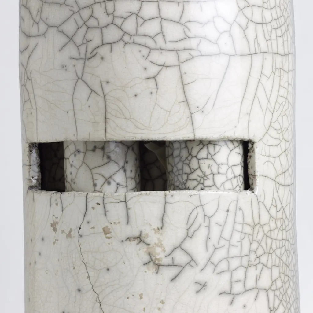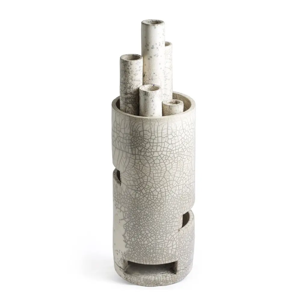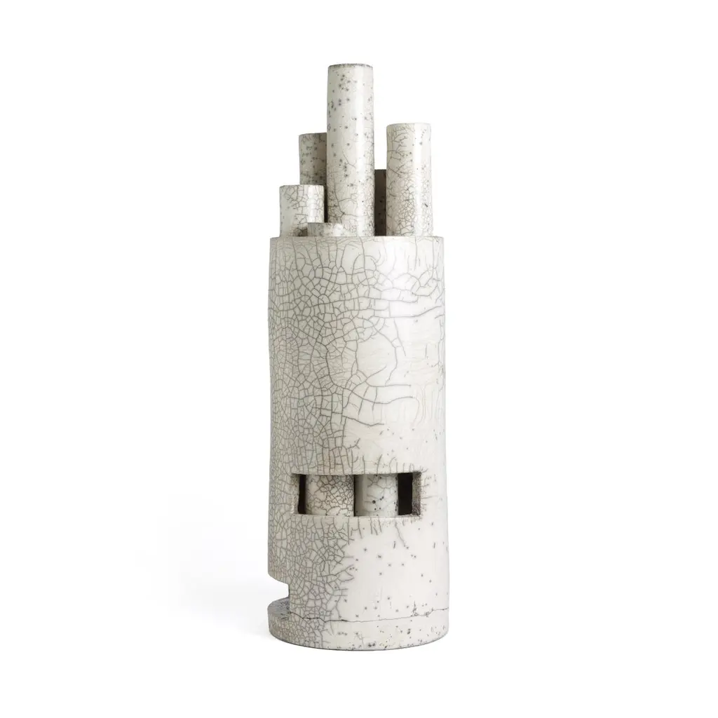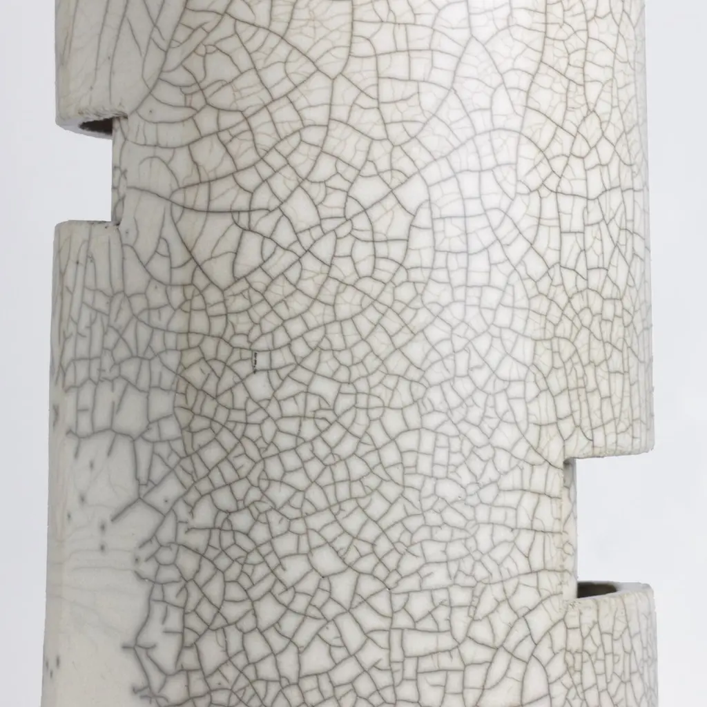Modern Metropolis L Candle Holder Sculpture Raku Ceramic White Crakle