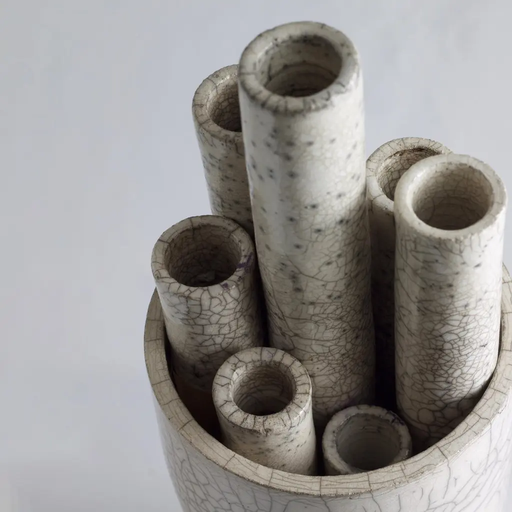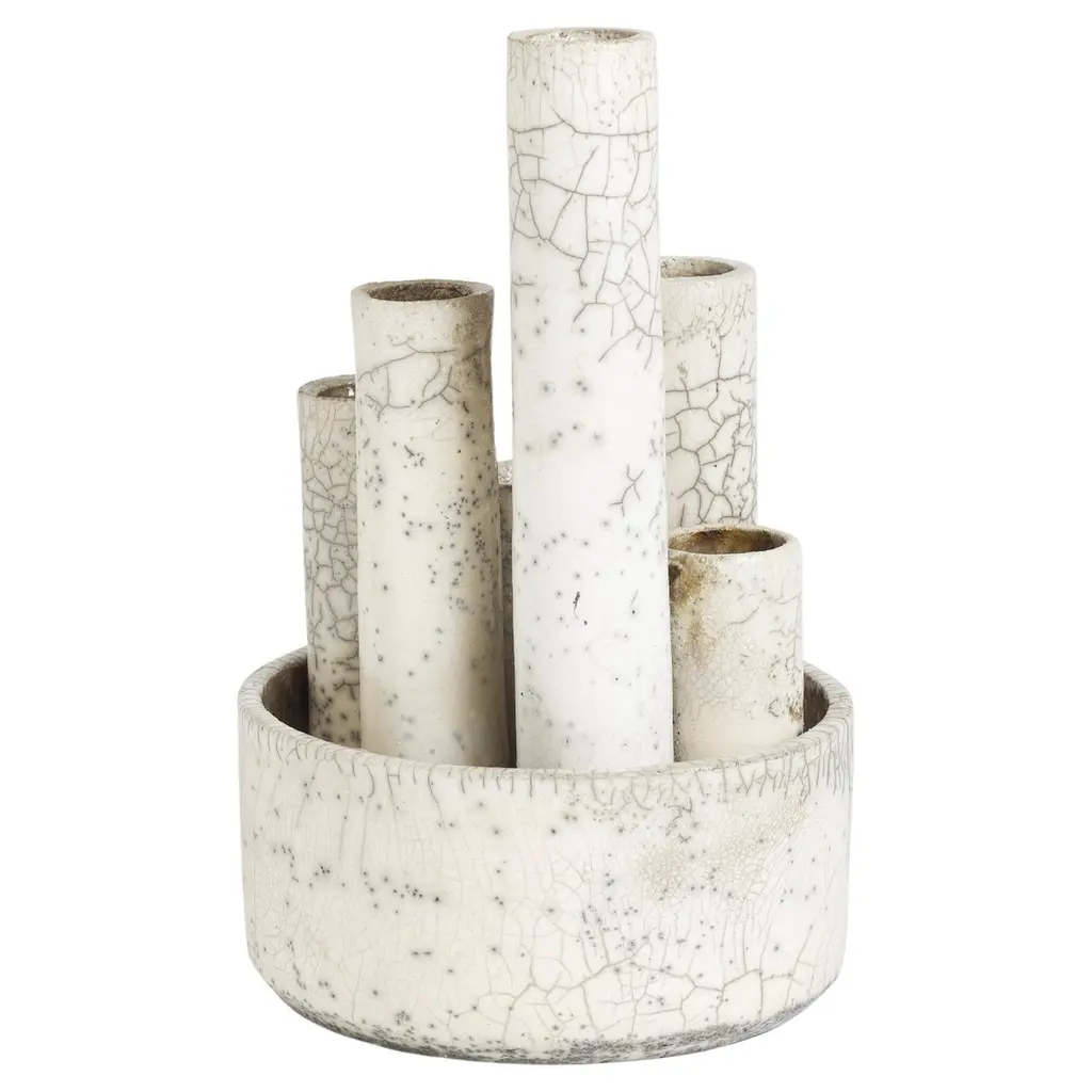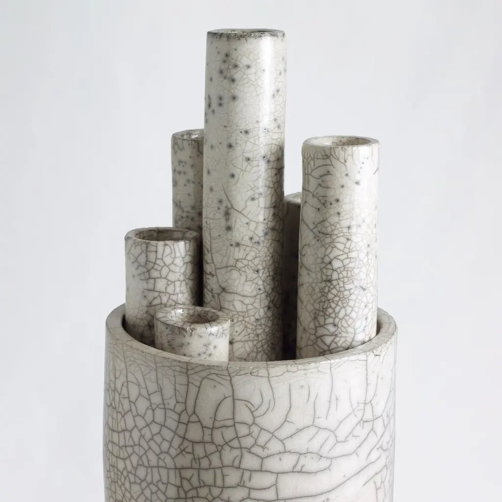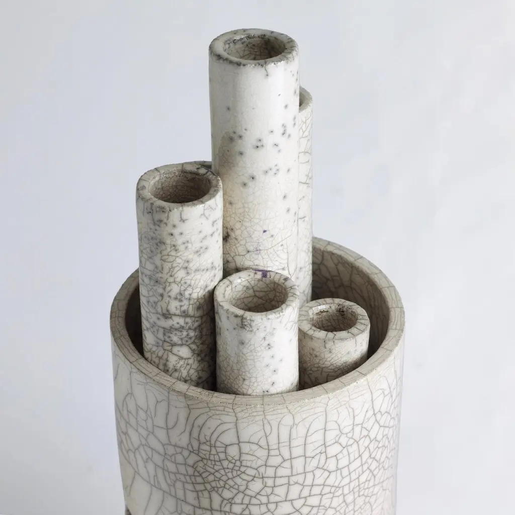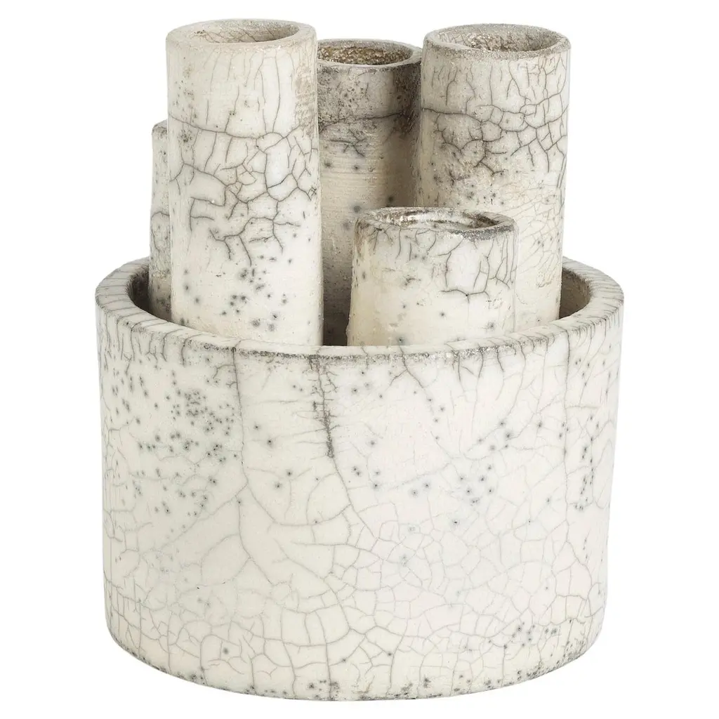 Modern Metropolis L Candle Holder Sculpture Raku Ceramic White Crakle