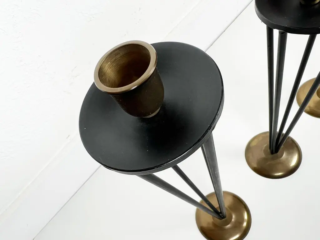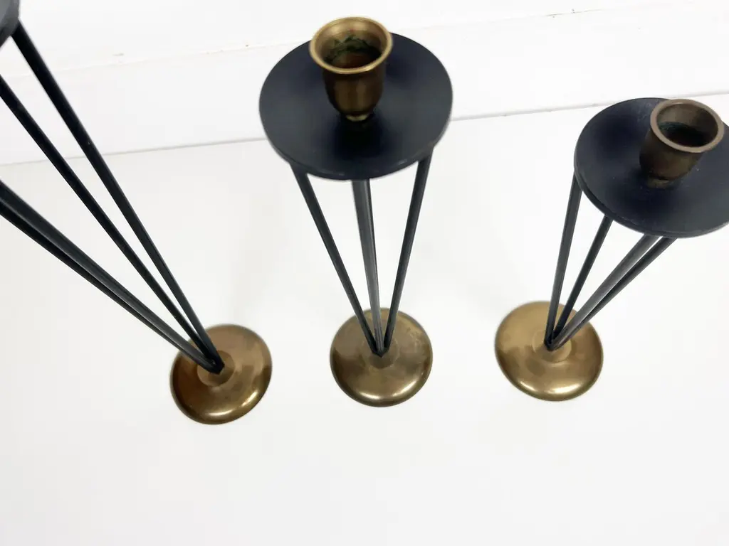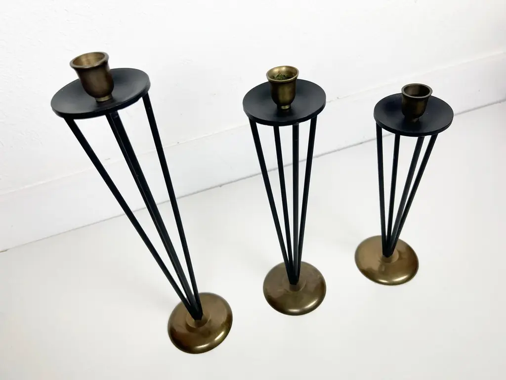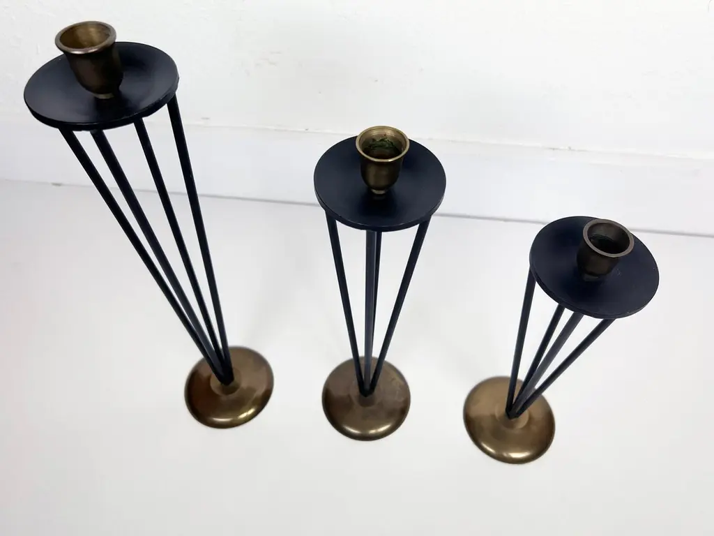 Vintage set of three black enameled metal and brass candleholders in varying size. Origin: USAYear 1950-60sDimensions: (15" tall x 3.25 diameter) (13" tall x 3.25" diameter) (11" tall x 3.25" diameter).