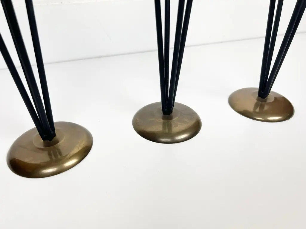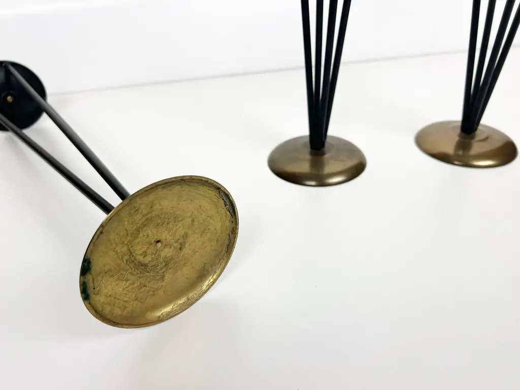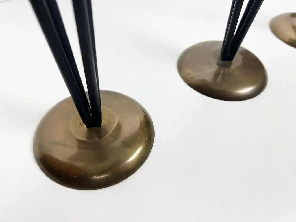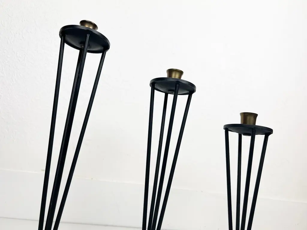 Vintage set of three black enameled metal and brass candleholders in varying size. Origin: USAYear 1950-60sDimensions: (15" tall x 3.25 diameter) (13" tall x 3.25" diameter) (11" tall x 3.25" diameter).