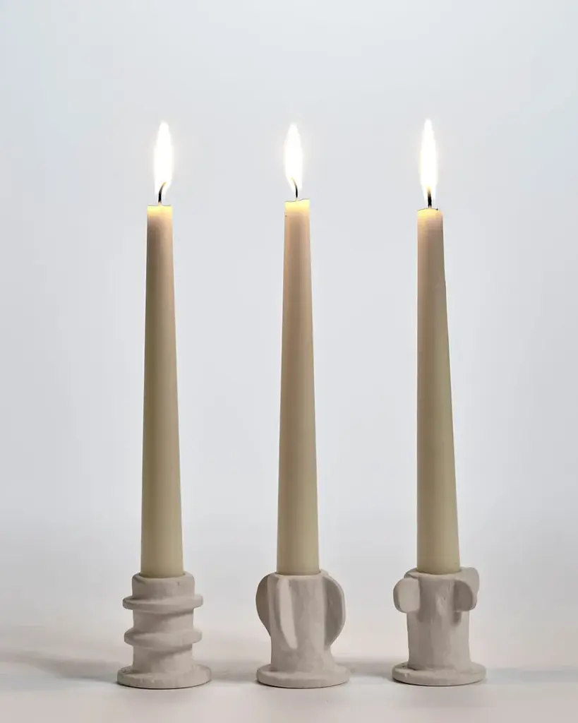 Molly ass/3 is a set of 3 candle holders made of stoenware.Please be aware that the price for each item is listed individually. A minimum order quantity of 3 pieces has been set to ensure you receive the complete assortment of three different shapes in the end. The white Molly candle holders are made of stone, with a matte finish on the outside and a glazed layer on the inside. Their graphic appearance immediately attracts attention in any room.Eclectic, a world full of wonderful extremes based on a well-thought-out structure. That is the first thing that comes to mind for the accessories collection of Marie Michielssen. Serax ’s resident designer likes variety, both in style and in her use of materials and colours. From papier-mâché through concrete to porcelain, cheerfully coloured or in muted natural colours, inspired by constructivism or by the earth in its most rudimentary form, each collection is completely different.