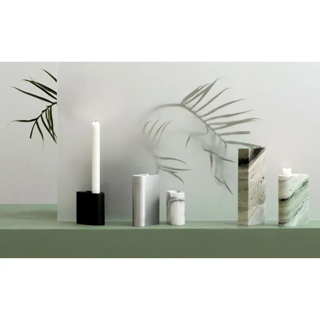 Northern's Monolith candle holder is an elegant candlestick, made of beautiful mixed white marble. The minimalist candle holder has a top hem where the candle is placed, and which contains the melting wax at the same time. Designer duo Morten & Jonas drew inspiration for the sculptural candlestick's appearance from quarries and traces they leave in the landscape. The natural roughness is also visible in the material used: as the Monolith is made of marble, the pattern, colors and veins of each candle holder vary. This is a characteristic of the natural material that only adds to the personal and unique look of the candlestick. The elegant Monolith candleholder catches the eye on its own but also sits beautifully in groups of several candlesticks of different colors, patterns and sizes.