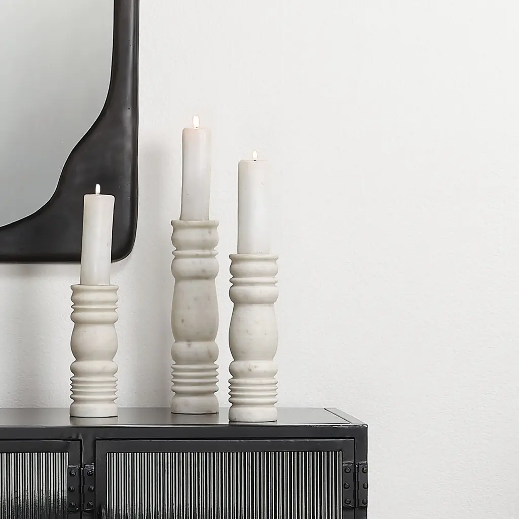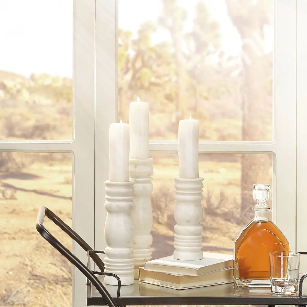 Beautifully artisan-carved of cool white stone, this set of three candlesticks pair classical inspirations with modern elegance. Whether used with your favorite tapers to light a special dinner or displayed on a mantel, this set is the perfect way to add the glow of candlelight to your home.