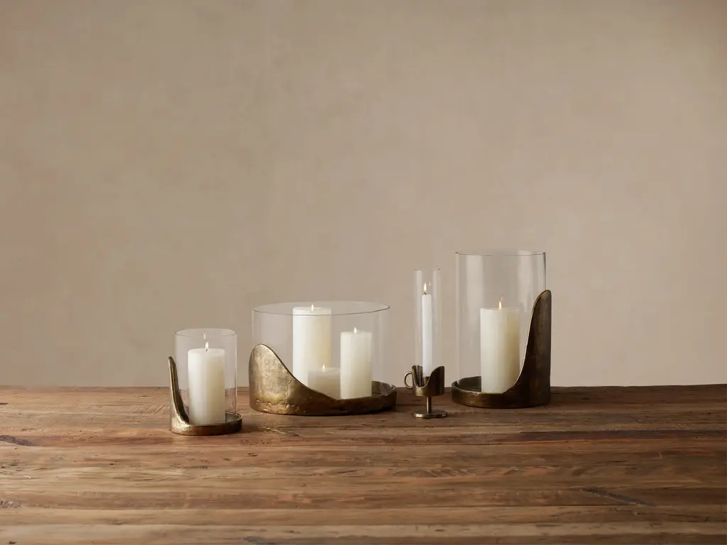 Inspired by organic forms, our Myles Hurricanes capture the beauty of nature through sculptural details softly cascading down the glass cloche and pooling at the base. Each cast aluminum base features an antiqued brass finish, inviting your favorite candles to glow with an elevated appeal. Large hurricane accommodates up to three pillar candles.