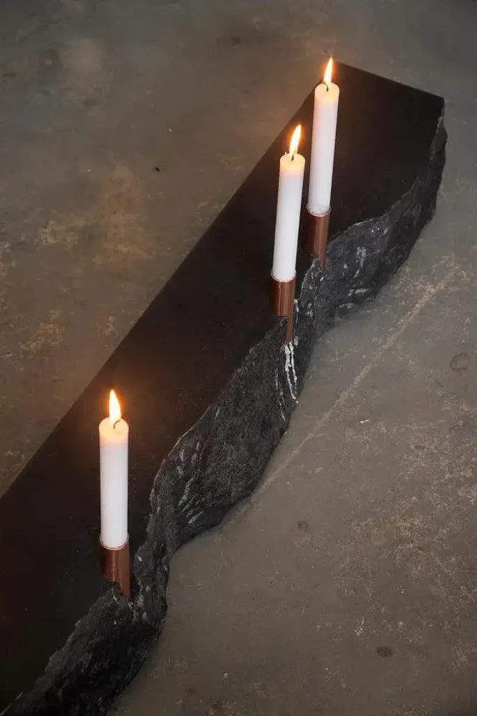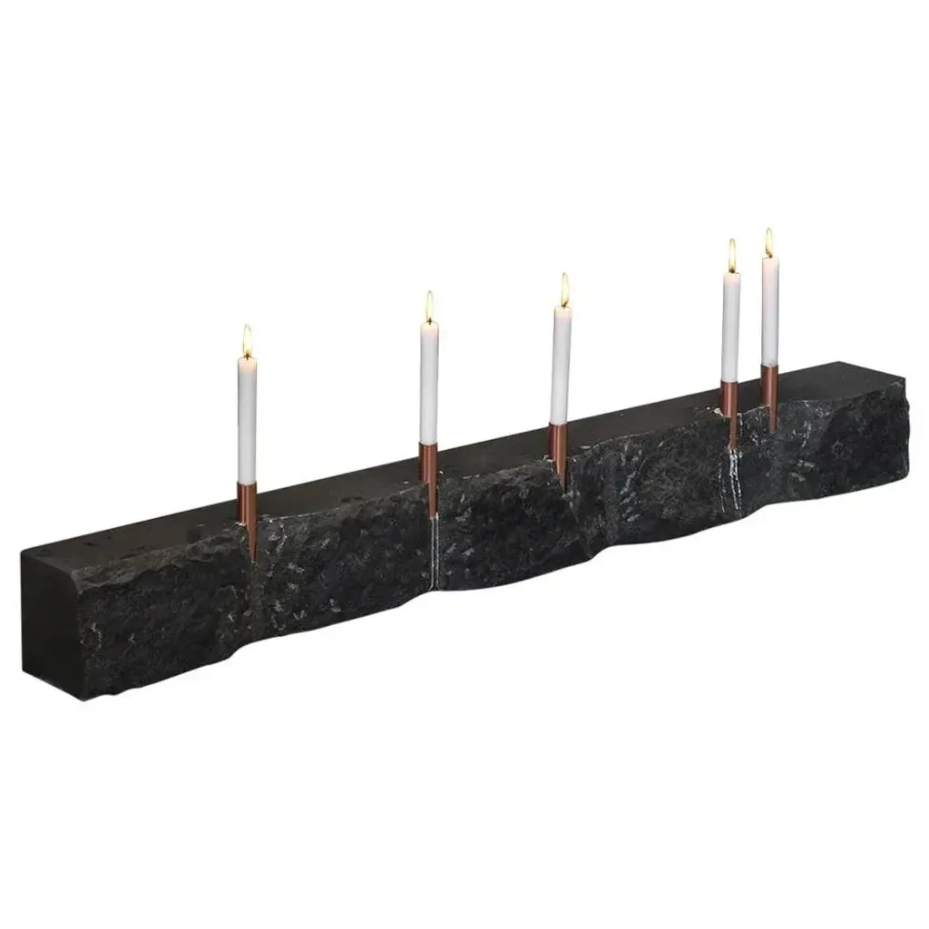 Nefti candle holder by Studiopepe. Dimensions: W 145 x D 15 x H 14 cm Materials: Nero abssoluto marble and copper. Multifaceted design agency Studiopepe was founded in Milan in 2006. Eclectic, voguish, it is the brainchild of Chiara di Pinto and Arianna Lelli Mami, both of whom obtained their degrees in Industrial Design at the Milan Polytechnic University. Driven by their own distinctive multi-dimensional vision that arose from their studies in Interior and Industrial Design, their studio work encompasses art direction, styling, interior, and product design, with an integral vein of storytelling that connects everything together. Drawing inspiration from the unexpected, their contemporarily Classic designs are characterised by their equally Minimalist and eclectic nature, uniting poetic vision and rigorous design. Studiopepe studies the dialogue between contrast and juxtaposition, with experimentation of materials, investigation of formal archetypes, installations, and art manifesting as integral themes to their work. Their projects are recognizable by their strong iconographic identity, formed through the cross-pollination of contemporary mediums and artistic disciplines as well as extensive research of colours and materials. Arianna Lelli Mami has always been fascinated by the ways people live and inhabit space, considering design from a fluid perspective, free from rigid schemes. Passionate about art, she collects ‘objets trouvés’ that are then re-explored and utilized to create installations that often inspire projects for the agency. Chiara Di Pinto received academic training in fine arts and has collaborated as an interior stylist and journalist for many Italian and international magazines. Due to her innate artistic intuition, she has always had a strong interest in materials, shapes, and colours, shaping her instinctive approach to design and love of research.