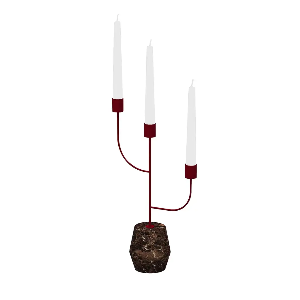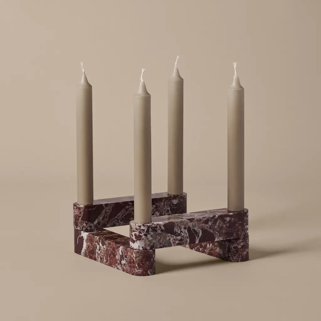 Four marble “bricks” you can reconfigure—line, square, stagger, or stack. Centerpiece in motion. From Ferm Living, the Newel Modular Candle Holder – Set of 4 (Rosso Levanto) is carved from solid red marble with pale veining that makes each piece unique. Each module holds a single standard taper; together they read like a small piece of masonry—architecture scaled to tabletop. Use all four for a dining centerpiece, split them between rooms, or arrange them in a ring for Advent. The weight keeps tapers steady; the stepped forms create height without fuss, so candlelight gathers between the blocks and reflects softly off the stone. Natural stone means subtle variation in tone and veining—part of the charm.