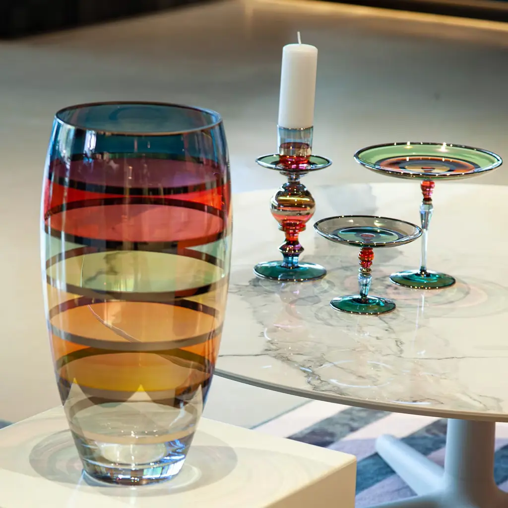 Drawing inspiration from the Olympic Torch for its sinuous body, this glass candleholder rich in colorful stripes makes for a spot-on addition to tables needing a pop of color. Glistening platinum rings lend it a luxe feel while amplifying the stunning reflections due to the interactions between light and transparencies. It is also a tribute to Milan's 2026 Olympic Games.
