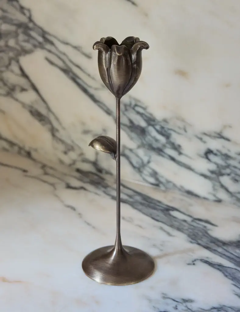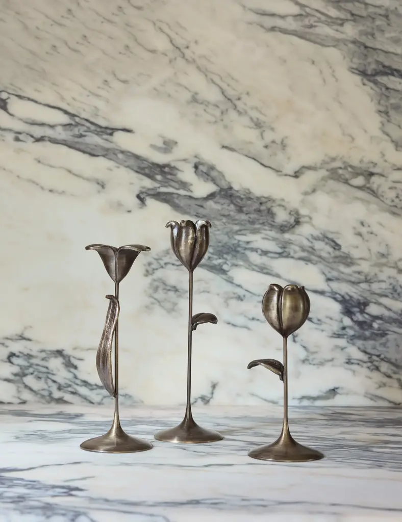 These handcrafted candlesticks offer a delicate touch of bronze. Their floral silhouettes strike fresh appeal from dining room to mantelpiece, bringing a signature finish to your design. This assorted set is from our exclusive Sarah Sherman Samuel collaboration and features all the trademarks of her warm, edited style.