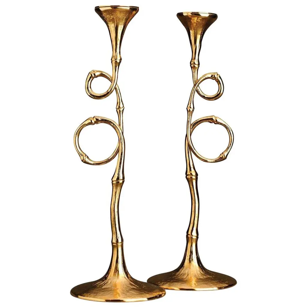 Marked by a timeless minimalist aesthetic, this sculptural double candlestick is a modern take on a traditional piece of home decor. Made of polished brass, the piece features two rounded bobeches with wide rims, two long, curved arms, and a flat base. Two small figurines complete the piece, one lazily hanging off an arm while the other rests comfortably against the main column. Perfect for showcasing tall, taper candles, this candlestick will elegantly illuminate any dining table.