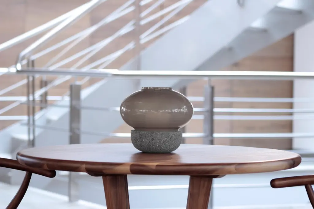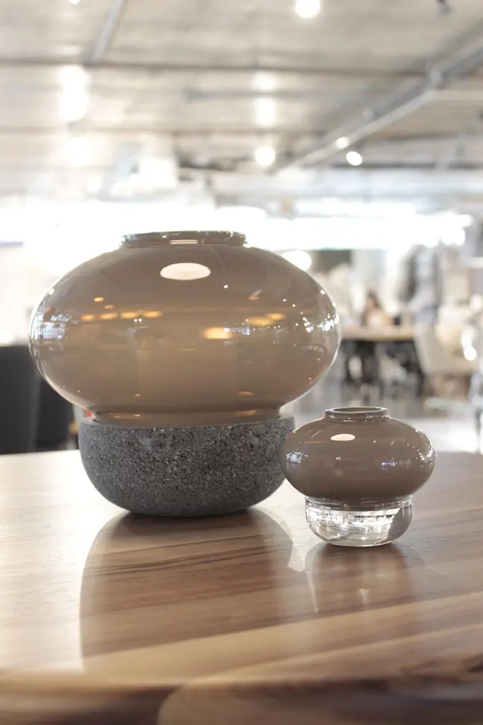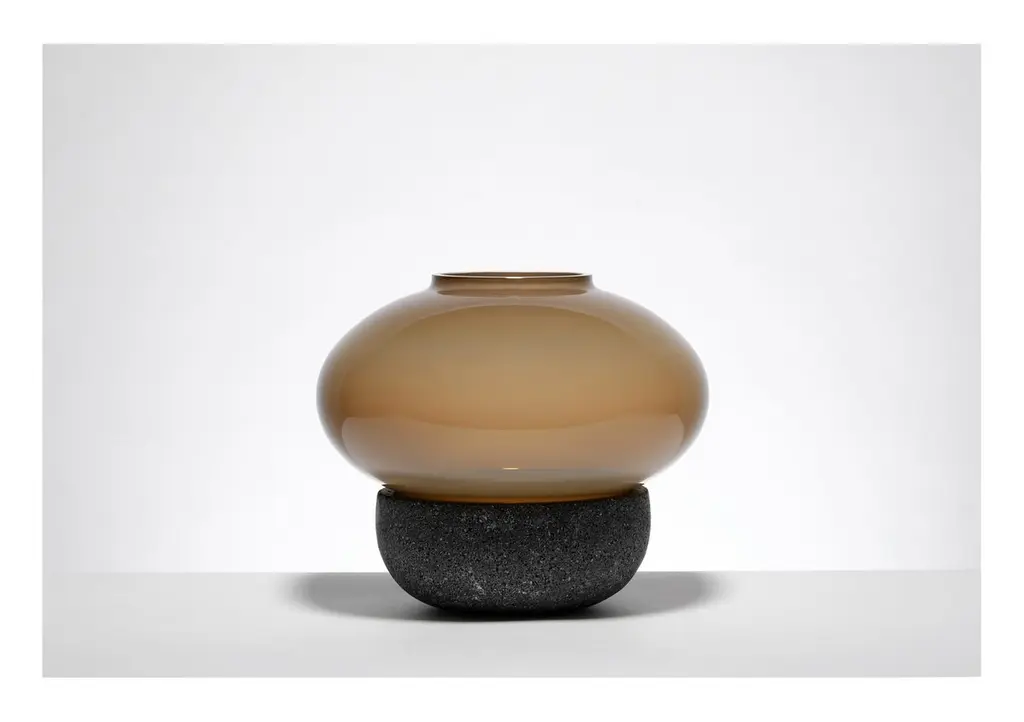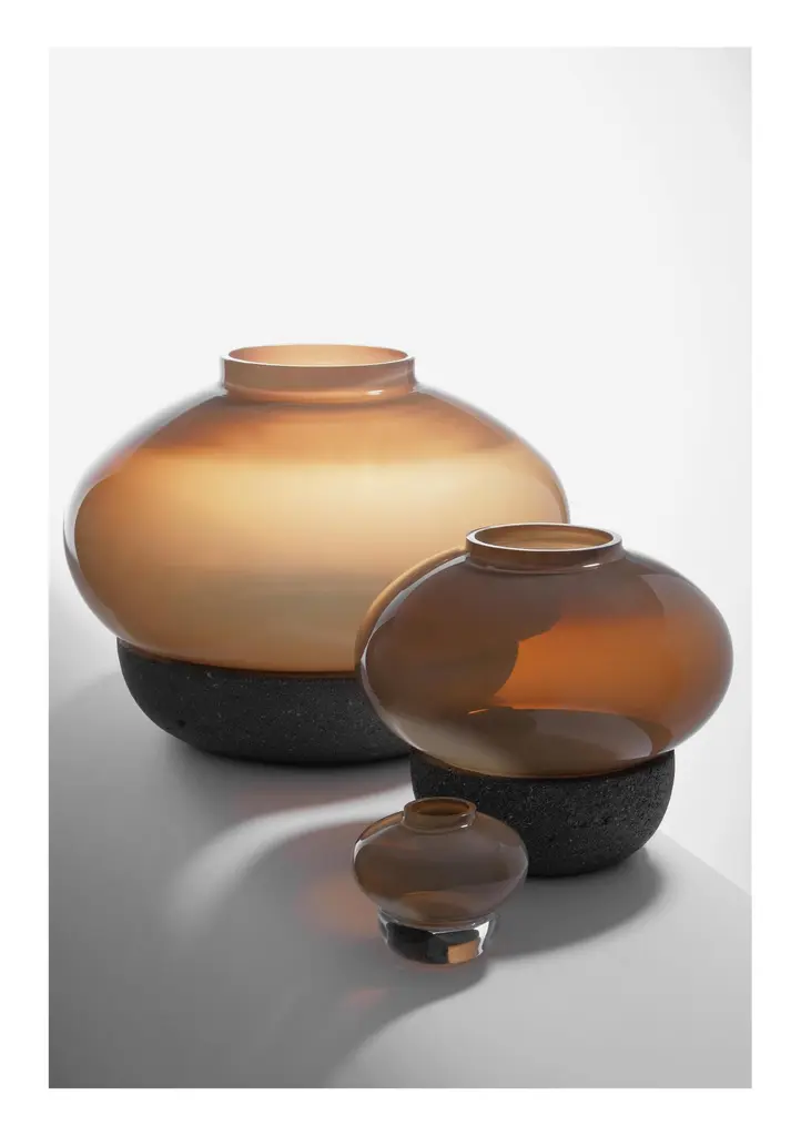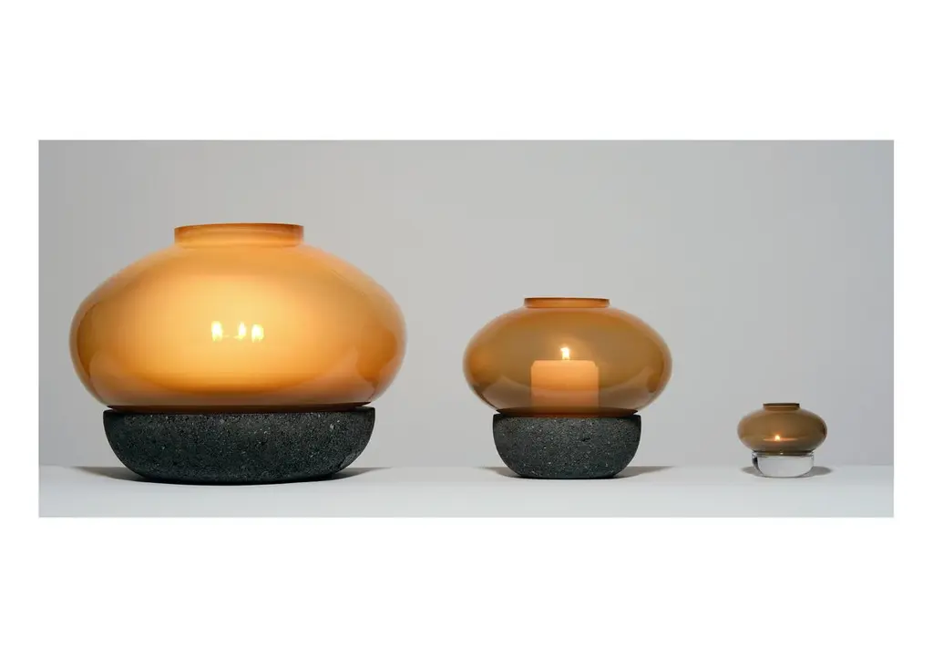 Inspired by the mysterious and fuzzy colors experienced as dawn comes to pass, this collection of candle lamps combines four different smokey tones that create subtle and atmospheric light. Three different sizes of glass shades can be combined with either a glass or volcanic stone base.