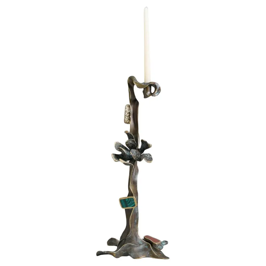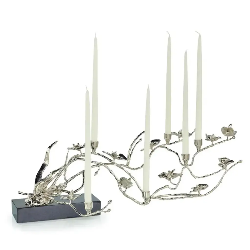 The Orchids in Bloom Candleholder is a gorgeous, naturally inspired statement piece crafted from brass in a Nickel finish. The design showcases a flowing orchid with detailed flora upon long serpentine stems that feature six candle sockets. The piece is mounted on a square base of natural black marble, completing the look.