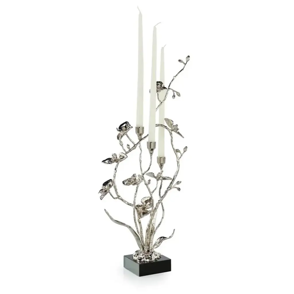 The Orchids in Bloom Candleholder is a gorgeous, naturally inspired statement piece crafted from brass in a Nickel finish. The design showcases a flowing orchid with detailed flora upon serpentine stems that feature three candle sockets. The piece is mounted on a square base of natural black marble, completing the look.