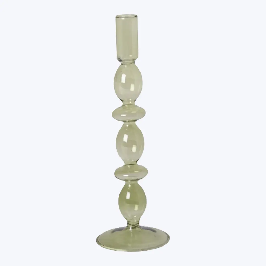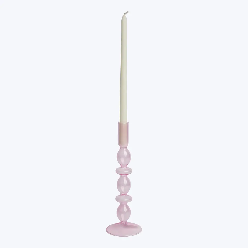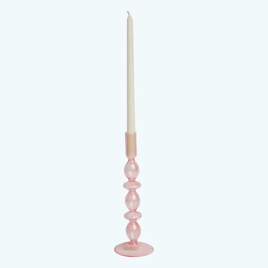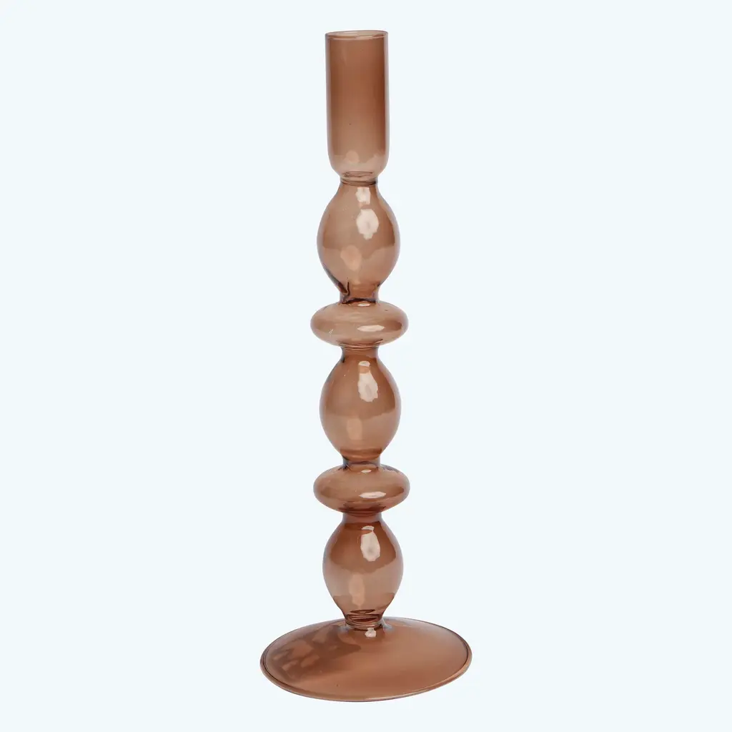 This Ornamental Glass Candlestick pairs perfectly with enchanting table settings for every season. This glass taper candlestick is blown in a sophisticated bubble shape with a colorful tint. A beautiful addition to your bookshelf, coffee table, or entryway display.
