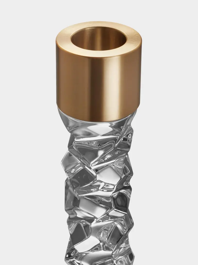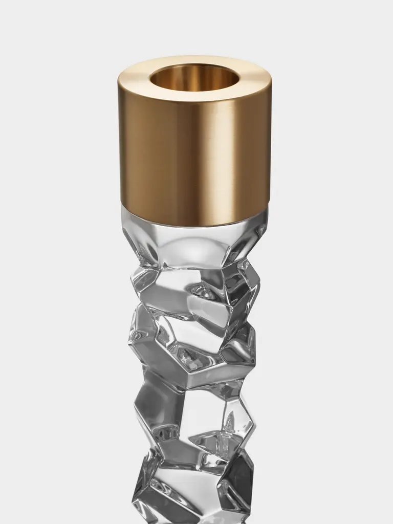 The Carat collection is based on a contemporary interpretation of the traditional cut glass for which Orrefors is world-renowned. The irregular geometry produces beautiful reflections of light in the crystal. The small candlestick in clear glass is available with details in bronze or stainless steel. Designed by Lena Bergström.