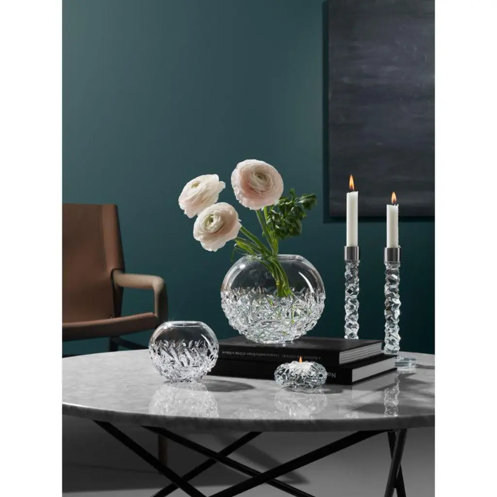 The Carat collection is based on a contemporary interpretation of the traditional cut glass for which Orrefors is world-renowned. The irregular geometry produces beautiful reflections of light in the crystal. The medium candlestick in clear glass is available with details in bronze or stainless steel. Designed by Lena Bergström.
