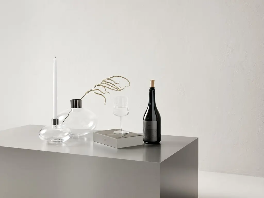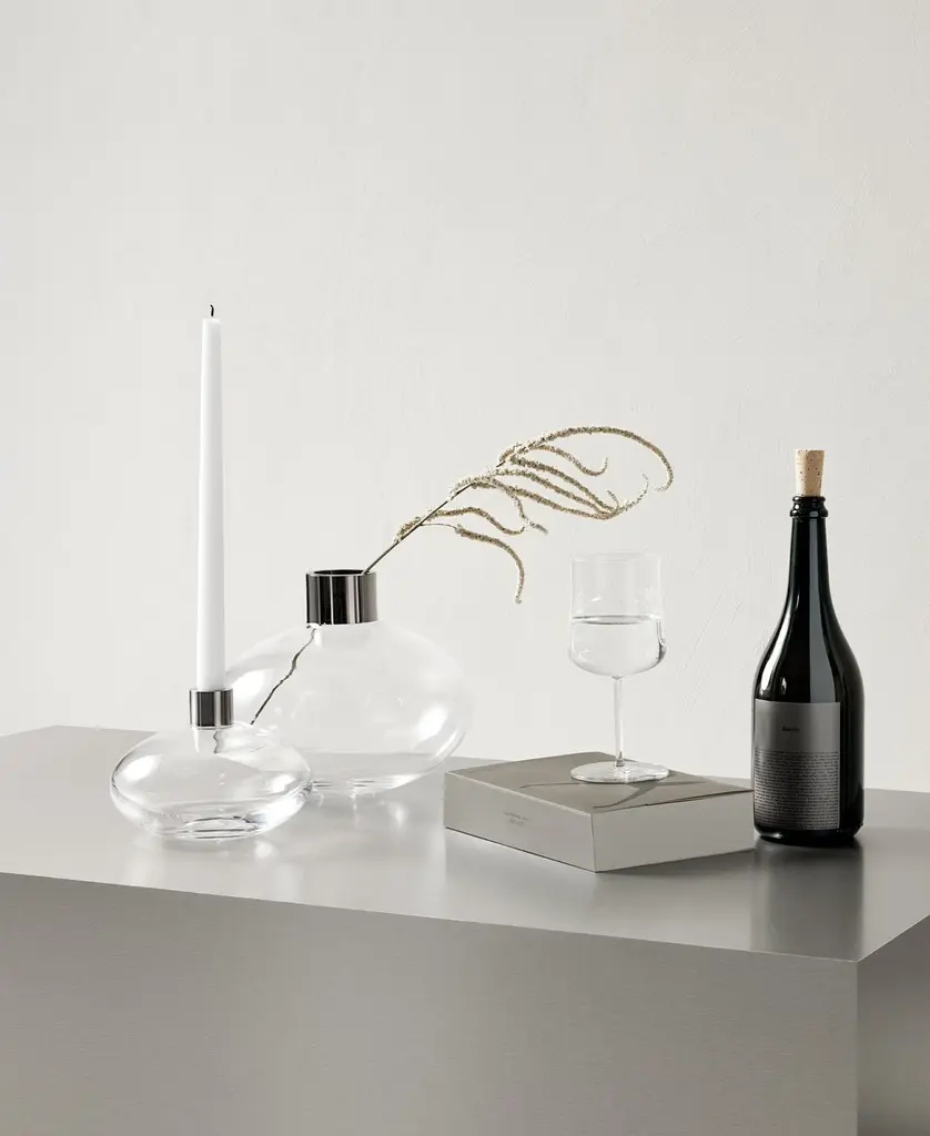 Pluto Candlestick from Orrefors in clear crystal has a minimalist, spherical shape influenced by Pluto – the heavenly body categorized as a dwarf planet. The candlestick holder is mouth-blown and has details in stainless steel. Designed by Lena Bergström.