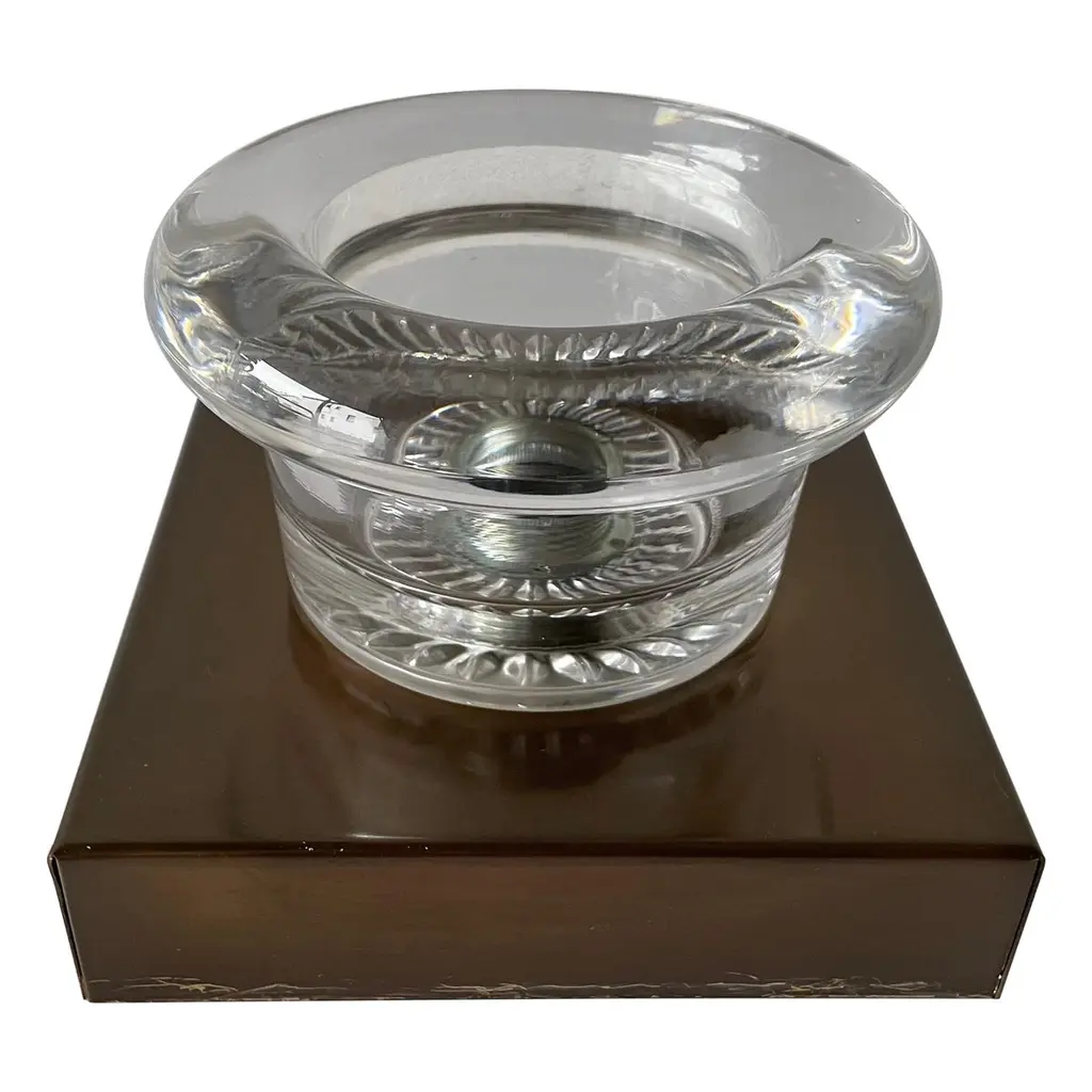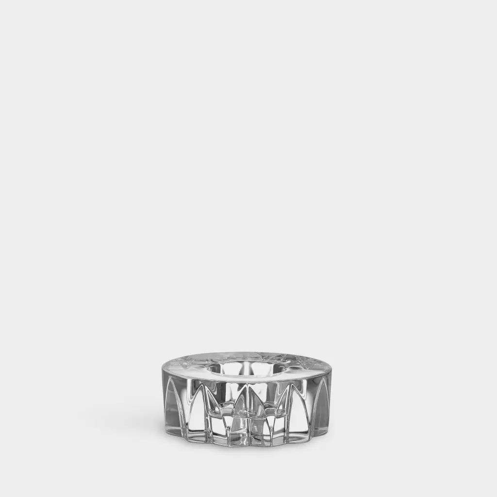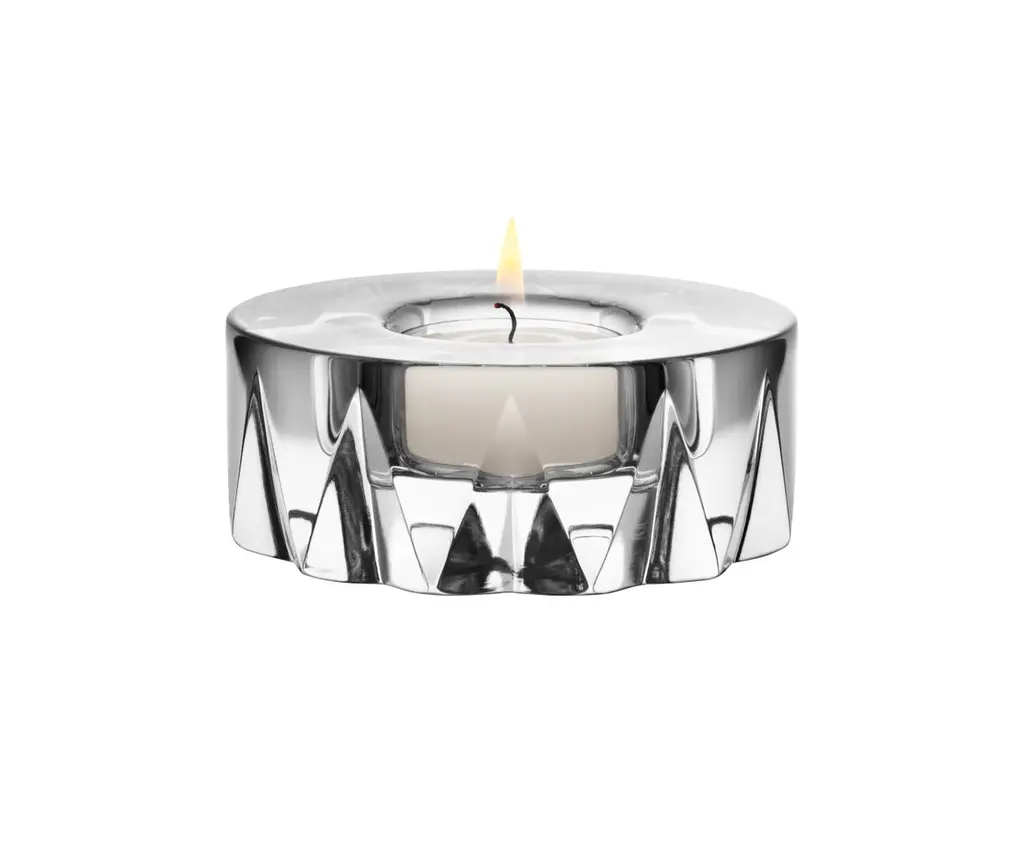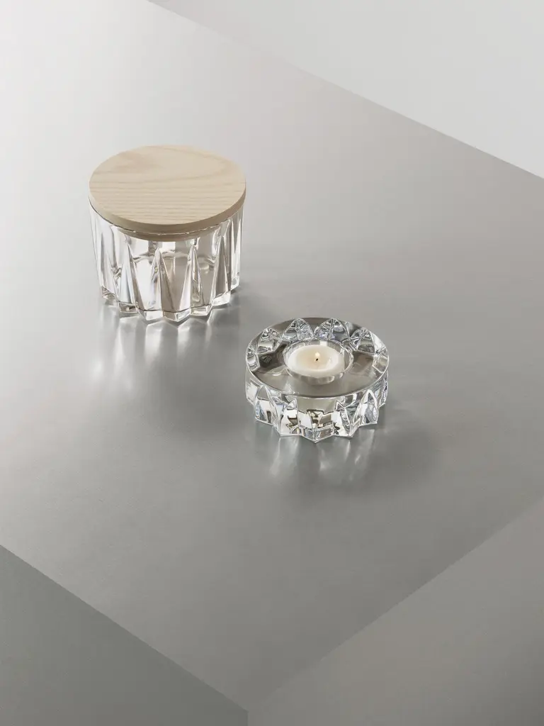 Sarek from Orrefors has deep-cut facets inspired by the motif on wooden baskets made of plaited birch bark, which has a symbolic connection to Swedish nature. The thick crystal votive is a functional design object, suitable for tealight candles. Designed by Lena Bergström.