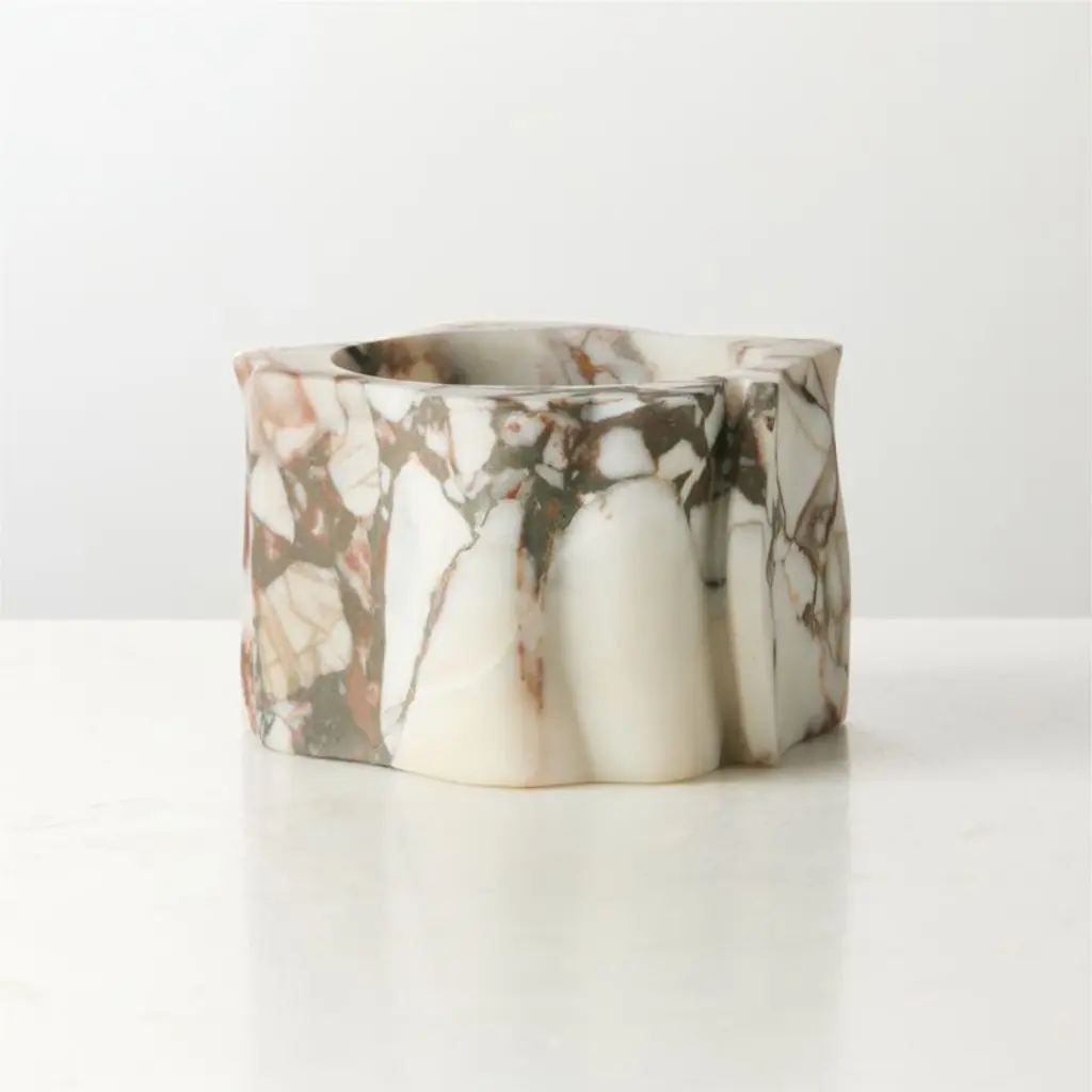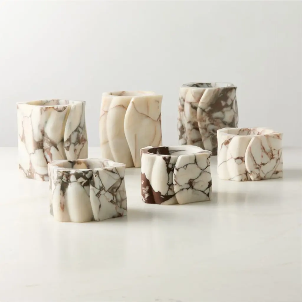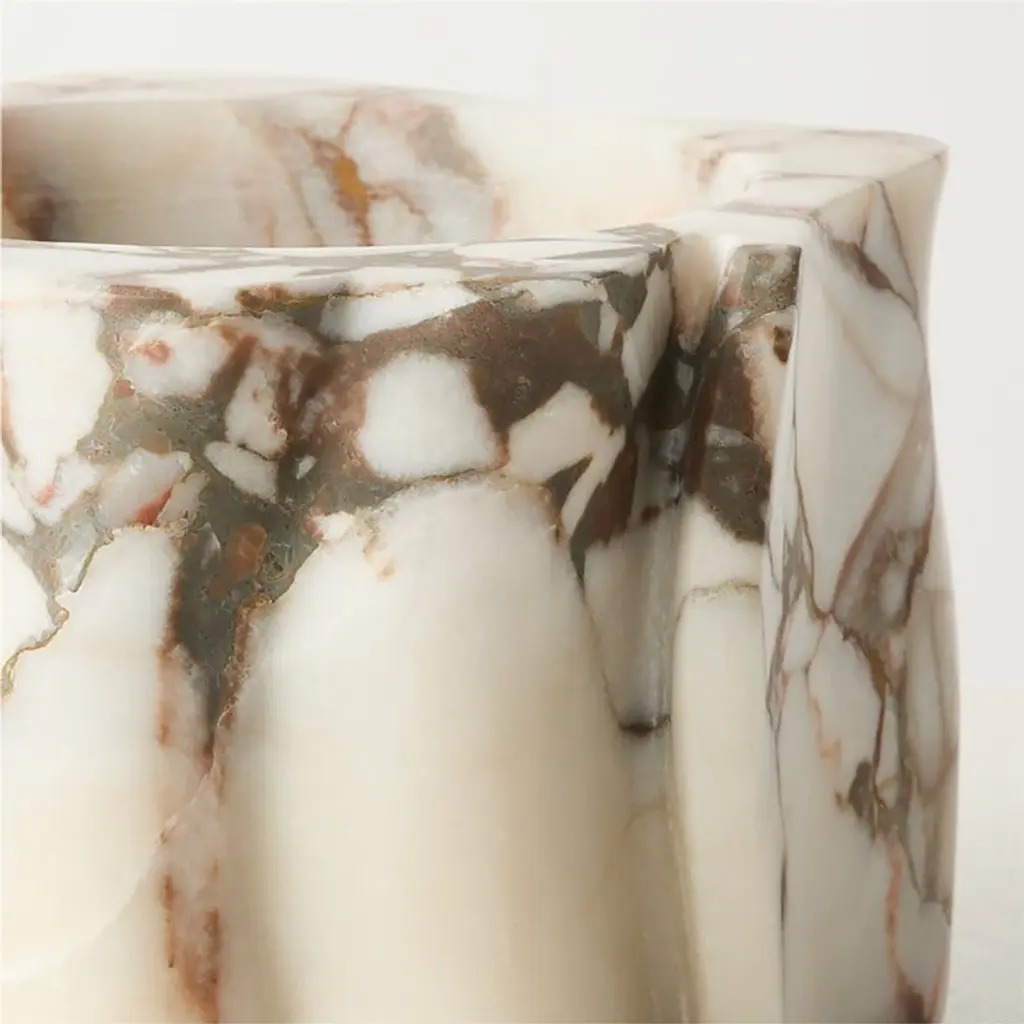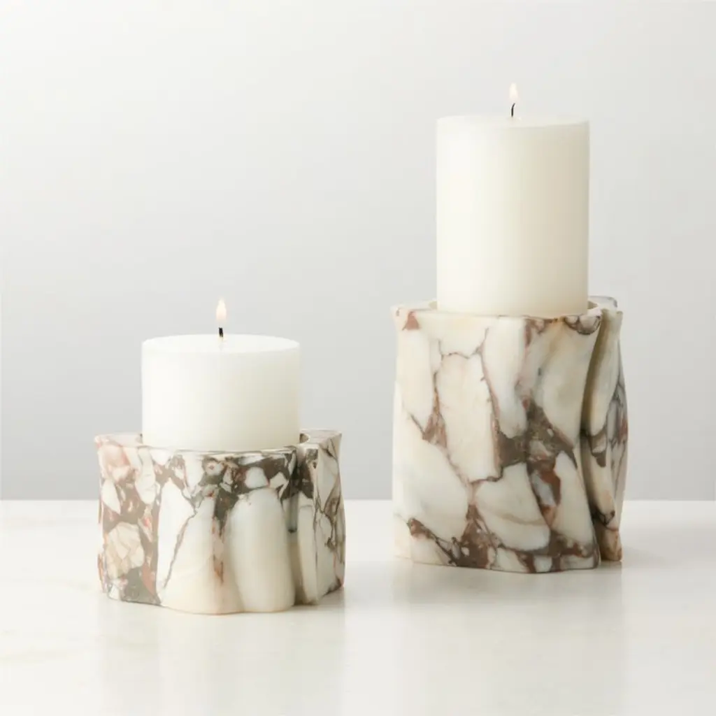 Hand-carved by artisans in Thailand, marble pillar candle holder is an elegant addition to the table. Sized perfectly for a pillar candle, the elegant ribbed shape accentuates the beauty of the active cocoa brown veining. Pair with the large Otalora pillar candle holder. CB2 exclusive.