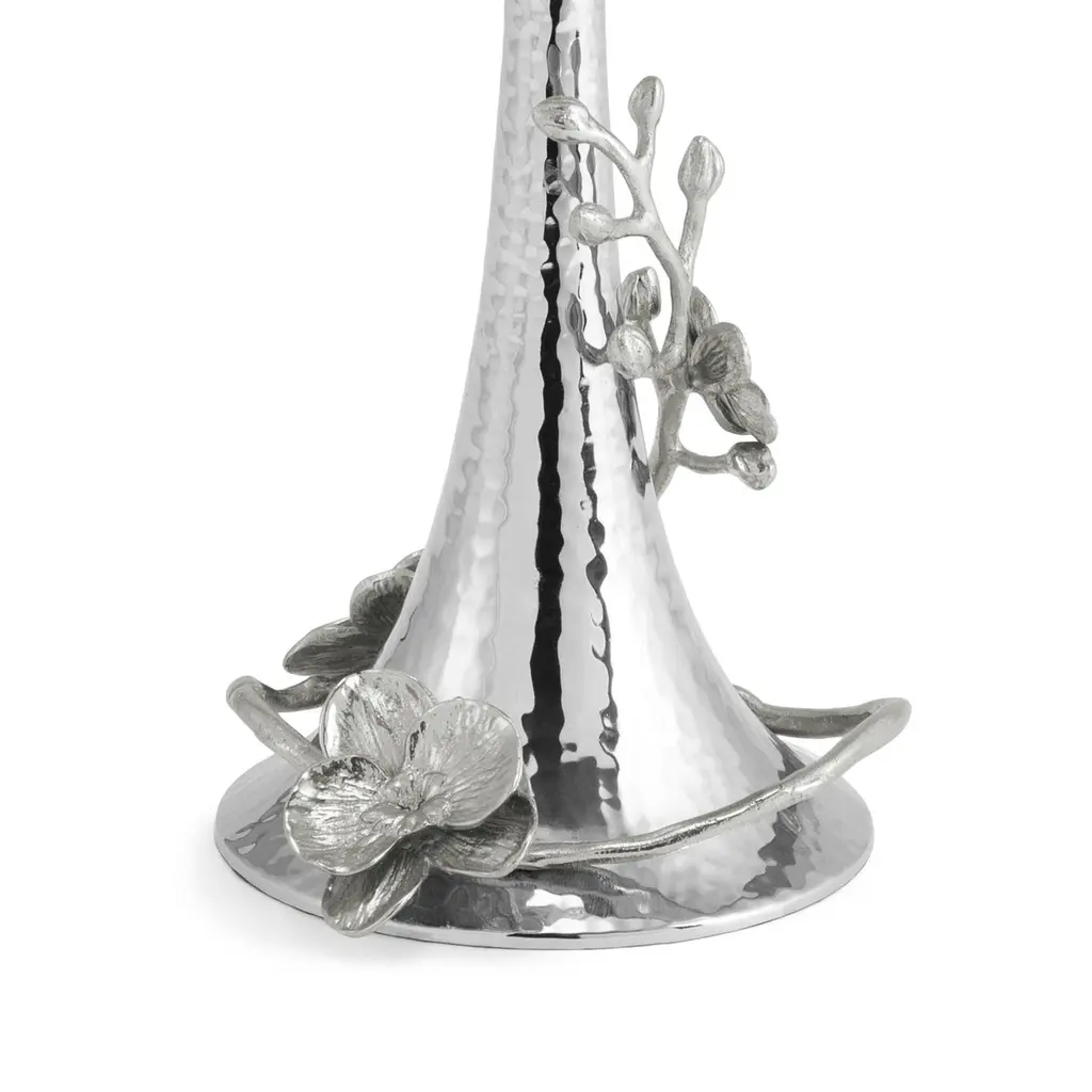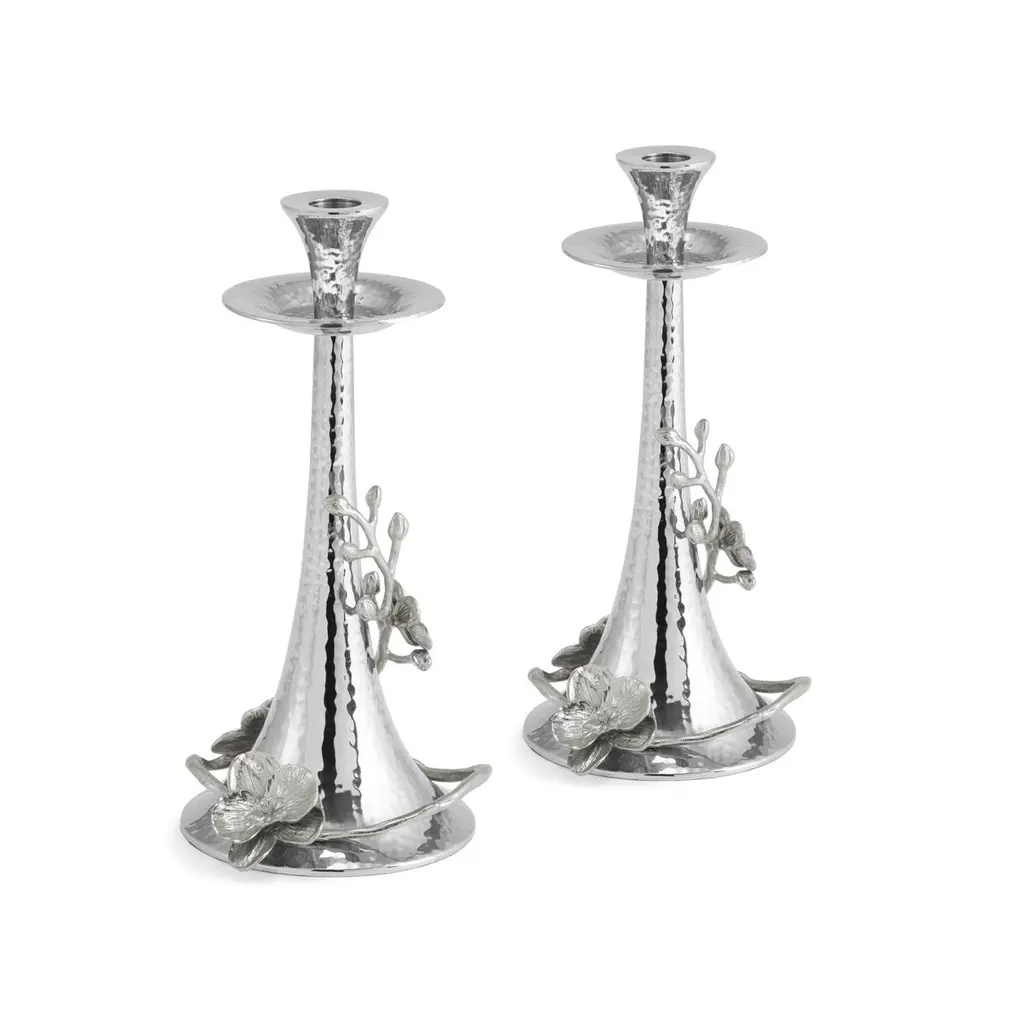 Pair of candlesticks with white orchid design, silver plated.Pair of contemporary candlesticks with white orchid design in silver-plated metal, 20th century.Enhance your ambience with the magnificent White Orchid candleholders, made from nickel-plated metal. The flowing design is inspired by white orchids, which symbolise purity and grace, evoking a sense of serenity and new beginnings. These pieces are perfect for adding a touch of artistic elegance to your décor.Candle holder: W: 14 cm, D: 13.5 cm, H: 28 cm (set of 2)