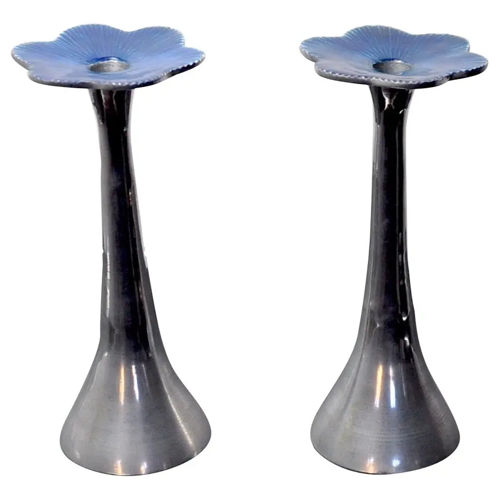 Pair Of Candlesticks With White Orchid Design, Silver Plated.