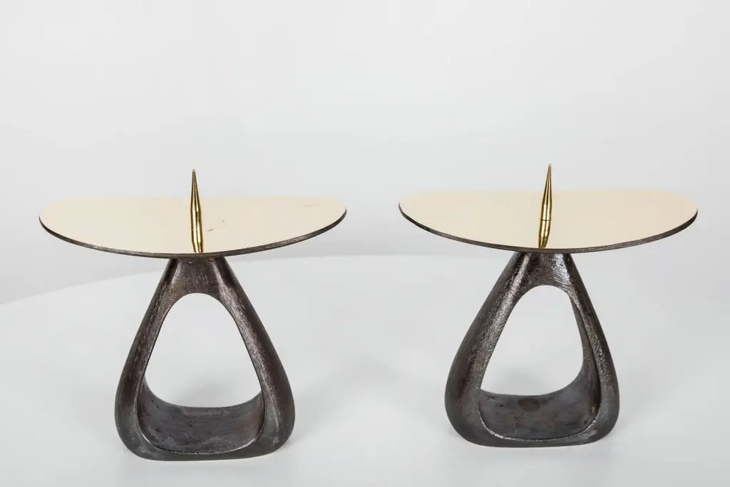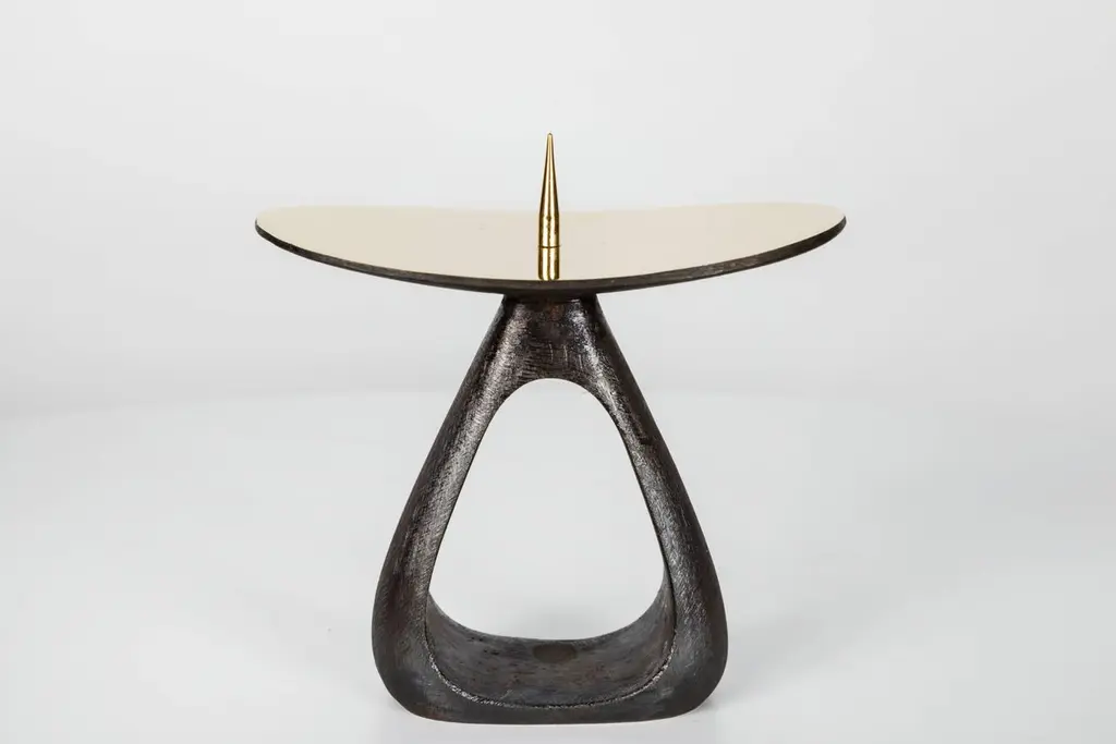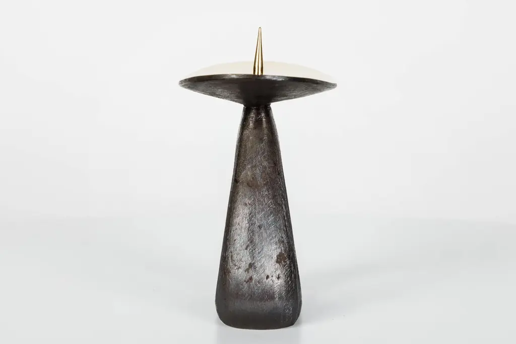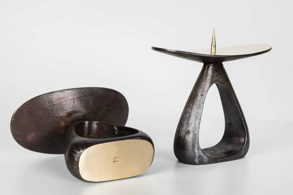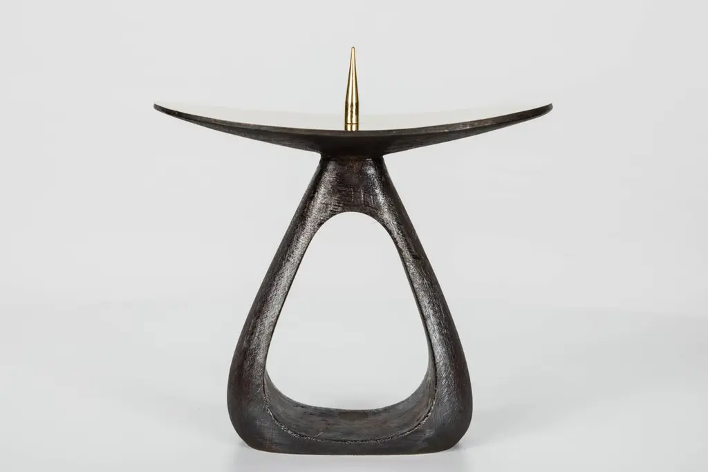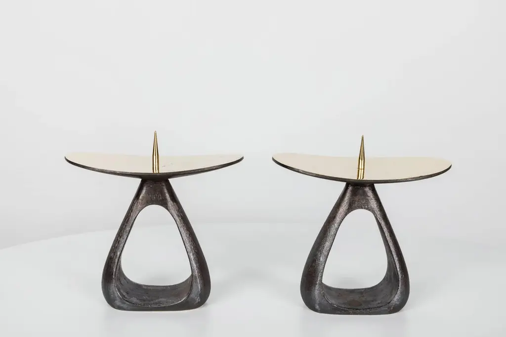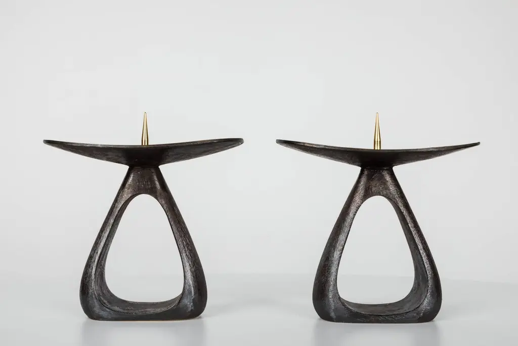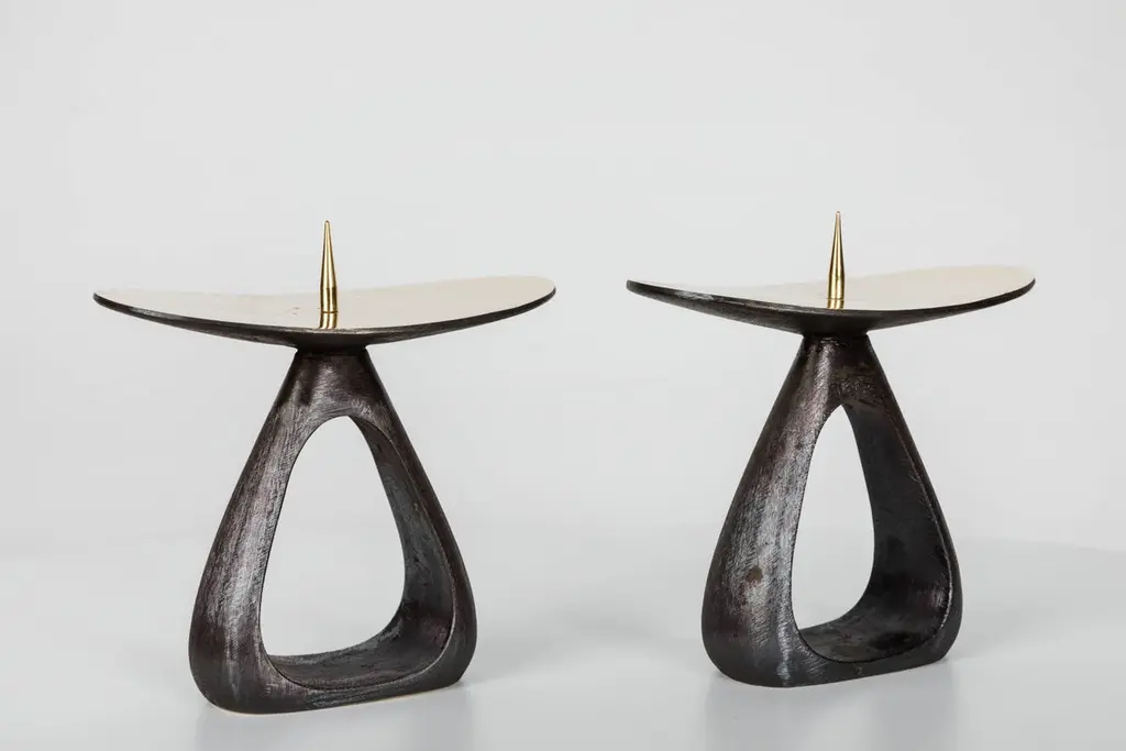 Pair of Carl Auböck #3470 Patinated Brass Candleholders.Designed in the 1940s, this incredibly clean and refined Viennese candleholder is executed in darkly patinated brass by Werkstätte Carl Auböck, Austria. Produced by Carl Auböck IV in the original Auböck workshop in the 7th district of Vienna using the same exacting standards, high-quality materials, original molds and techniques of his legendary namesake. Auböck's design career was long and varied, reaching its pinnacle of prestige at the Triennale di Milano in 1954, where he received four gold medals in recognition of his iconic work.Price is per pair. Available in unlimited quantities. Two in stock and ready to ship. Please note that in-stock availability is subject to change at any time. Allow additional 3-4 weeks for items not in stock. Can take up to 8 weeks or more.Please note that only one representative example of each item is shown in the images. Finish varies from item to item due to the handmade nature of their fabrication and due to the unique chemical patination process, which is meant to simulate 80-100 years of exposure of brass to sunlight.Made to order. All sales are final.