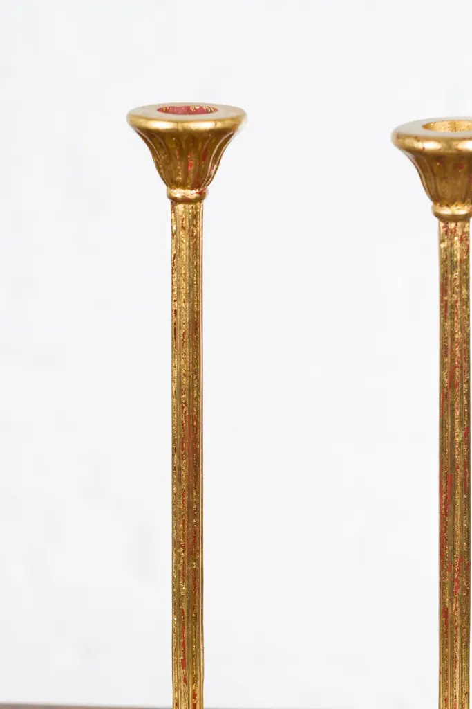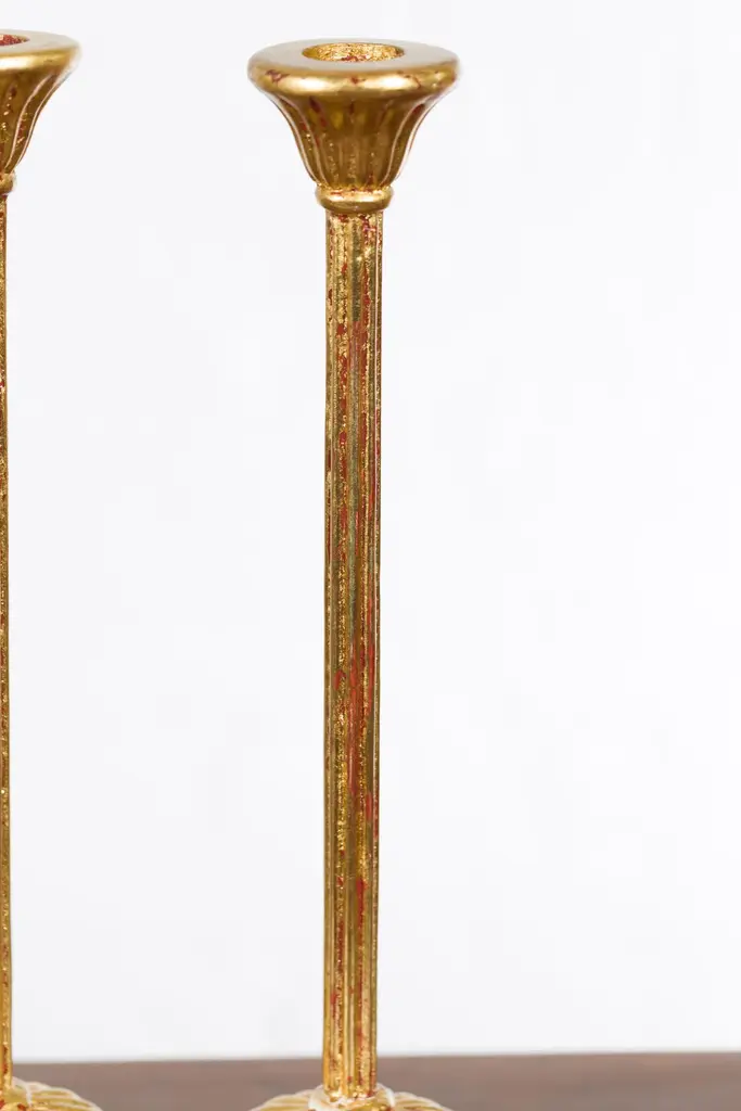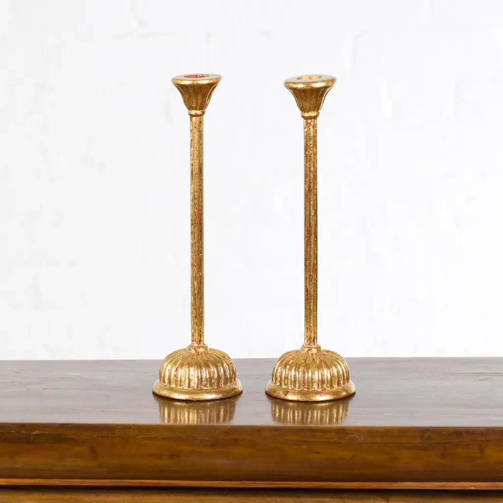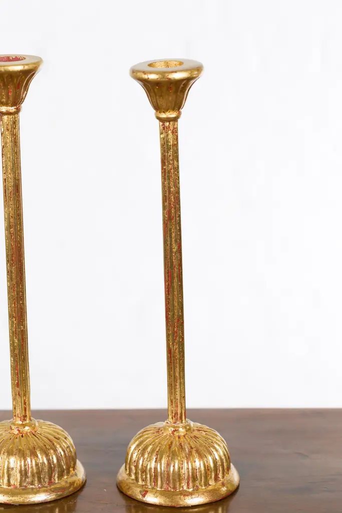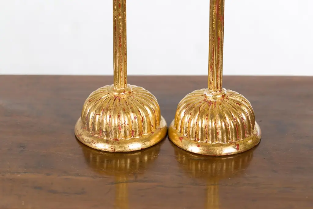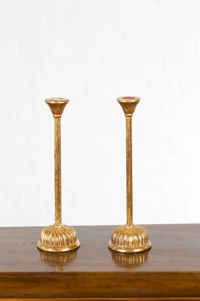 A pair of Japanese vintage gold lacquered candleholders from the mid 20th century with lotus bobèches from a Hinamatsuri set. Created in Japan during the midcentury period, each of this pair of candleholders features a lotus shaped bobèche sitting above a simple shaft resting on a gadrooned base. Showcasing red undertones, this pair of gold lacquered candleholders, taken from a Hinamatsuri set (Hinamatsuri being a festival also called Girls' or Dolls' Day), will be a lovely addition to any chest or side table.