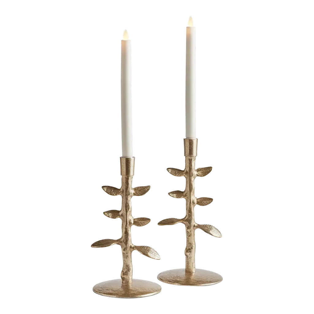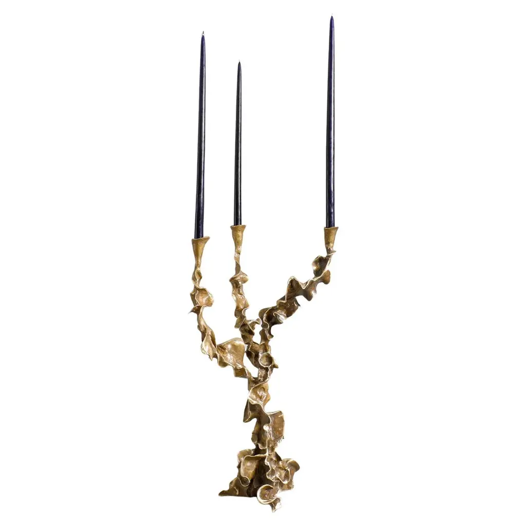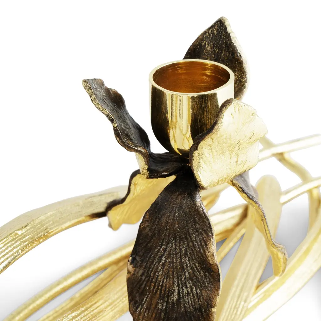 Pair of low candlesticks with iris design, gilt and patinated metal.Pair of contemporary low candlesticks with iris design in gilt and patinated metal, 20th century.Candlestick: W: 43 cm, D: 38 cm, H: 12.7 cm (set of 2)