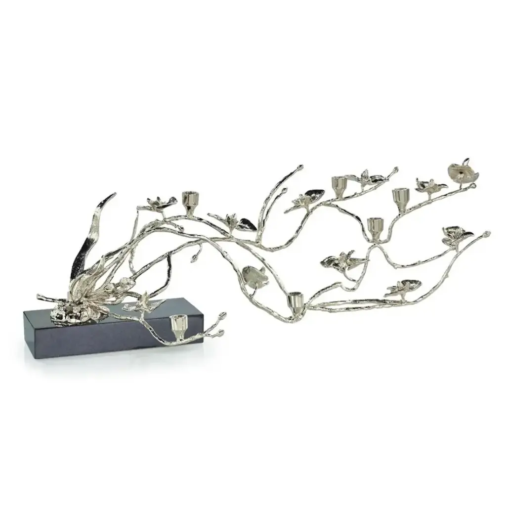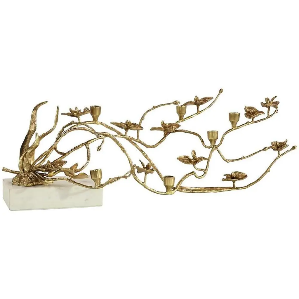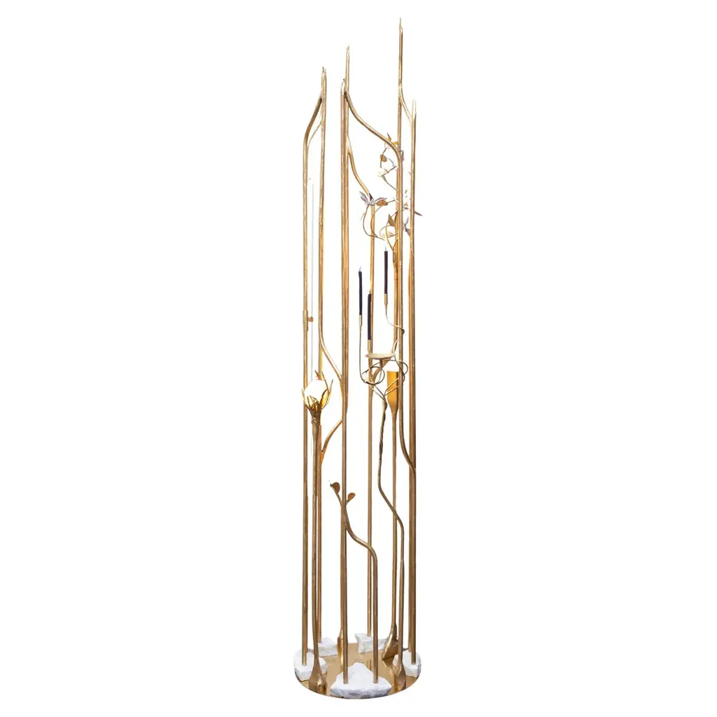 Pair of low candlesticks with iris design, gilt and patinated metal.Pair of contemporary low candlesticks with iris design in gilt and patinated metal, 20th century.Candlestick: W: 43 cm, D: 38 cm, H: 12.7 cm (set of 2)