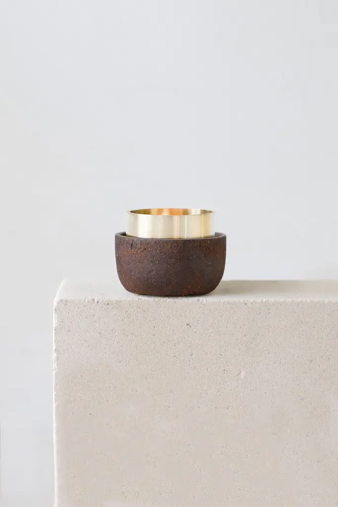 Pine candle holder by Evelina Kudabaite StudioHandmadeMaterials: pine, brassDimensions: H 55 mm x D 65 mmColour: reddishNotes: for dry useSince 2015, product designer Evelina Kudabaite keeps on developing and making GIRIA objects. Designer firsthomeware collection launched in 2015 during the London Design Festival. Everyday objects are used, seen, touched. Tactility and expressive qualities of materials have important communicative value, so the design process requires for intense research on textures. GIRIA is a homeware collection balancing between tactility, shape and color. The project is aimed to pass the sensations of the forest through material, to establish a connection between the user and the object. This collection is result of an experimental process by which it was meant to show how materials, which are destined to become waste - tree bark and leaves - can be transformed into sustainable design through the traditional crafts.It is a research on the alternative and unconventional ways to shape wood, which reminds of the culinary process. During the research a recipe of a unique material that consists of harmless organic substances has been found. No two items in GIRIA are the same: each is made by hand and the bark dust of different kinds of trees gives a unique texture, varying in colour and roughness of a surface. It takes time to make a piece in GIRIA, that is considering preparation of the bark, drying time - from days, to weeks - and variability of the process. All the items are coated with mix of foodsafe oils to make it more durable. The materials in GIRIA may change slowly over time and the collection distinguishes itself from mass production, making the products as individual as their owners.Evelina is a product designer based in Vilnius, Lithuania. Her research usually starts from materials and processes which transform them into design objects. She is fascinated by the narrative hidden in a product and by its power of carrying knowledge, memories and emotions in a more concrete and tactile way. When designing something, she wants to tell a story, to create a reaction of wonder and curiosity in the people who are going to interact with the object.