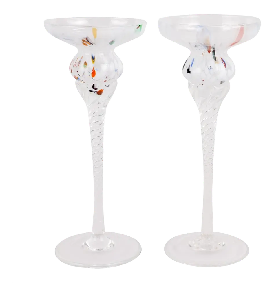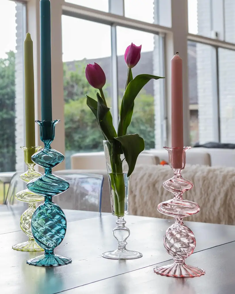 These charming candlesticks are mouth-blown using borosilicate glass. They are wonderful scattered down a dining table or placed in a powder room. Care Instructions: Wipe With Dry Cloth