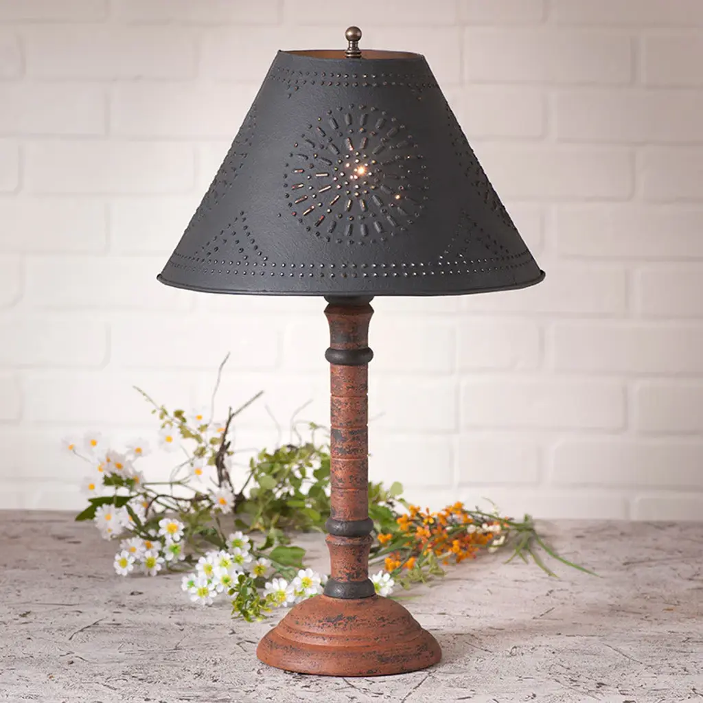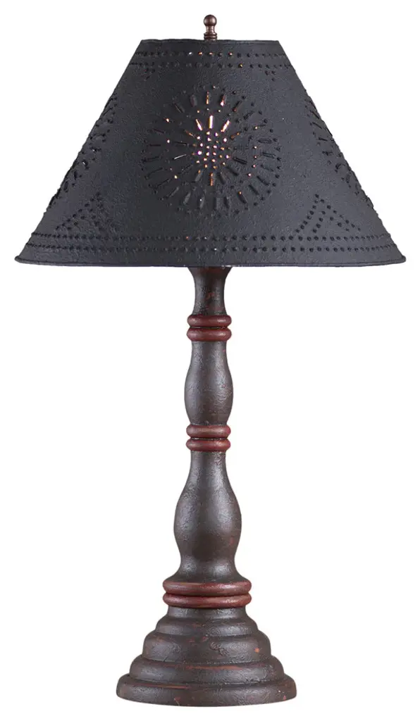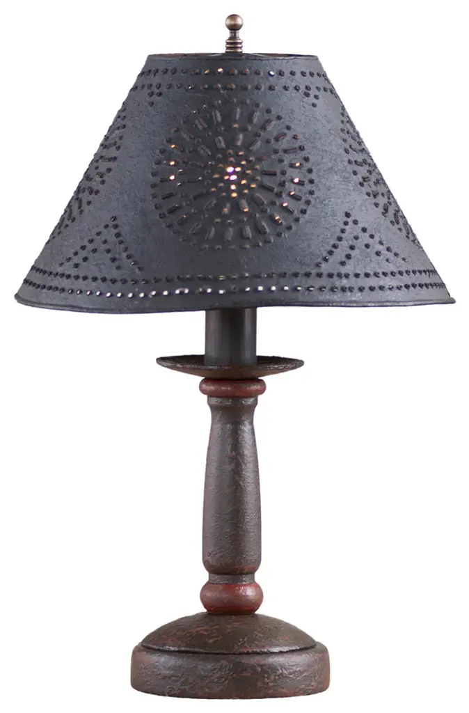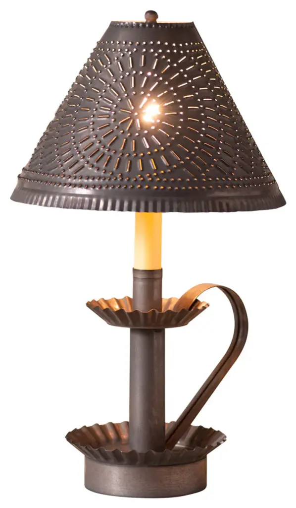 The Plantation Candlestick Lamp is a small lamp that is large on character. The warm glow of the light through the piercings will wash your walls with light patterns. It is truly an affordable and beautiful piece to add to your home''s lighting.Wired with one E12/Candelabra socket, 60 watts maximum. Small clip harp included. Kettle Black finish. Handcrafted in Pennsylvania.• Measures 16.5-Inches high and 9-Inches diameter• Wired with 7-foot cord and line switch Plugs into wall outlet E12/Candelabra socket, 1 x 60 watts maximum wattage• Shade included• Made in the USA