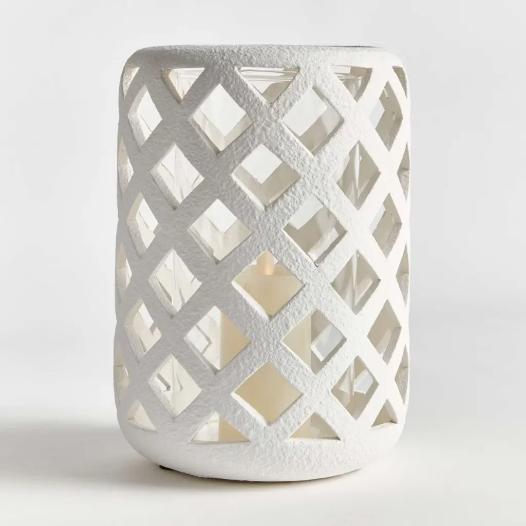 Expertly crafted from hand cut ceramic strips, and finished in a bright white glaze, this hurricane lets all the light shine through. Complete with a glass insert, it is a beautiful way to display a tea light or small pillar candle.