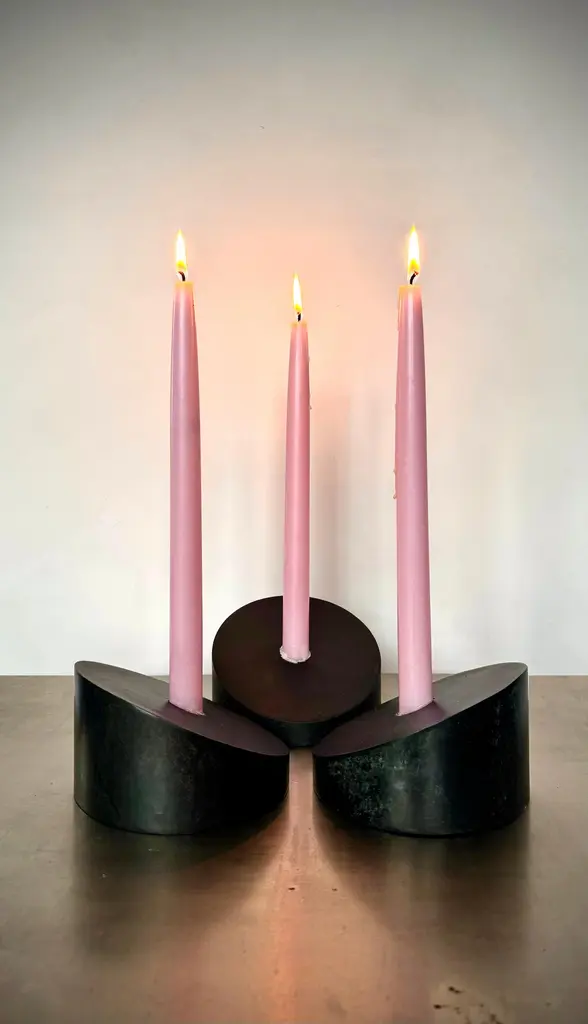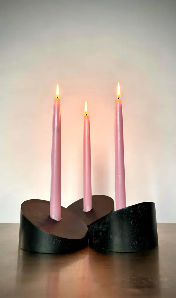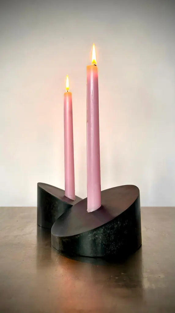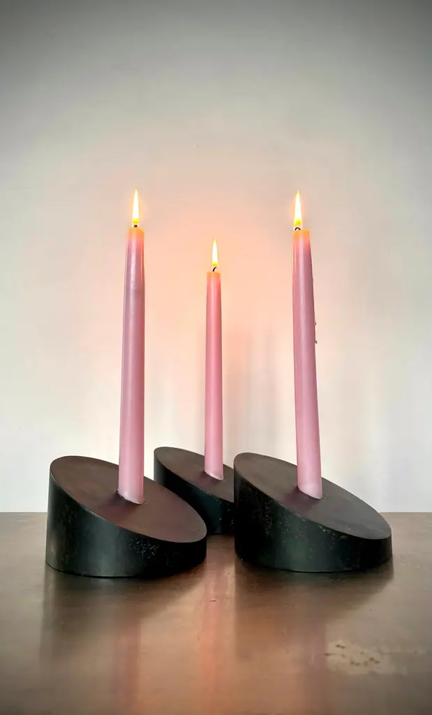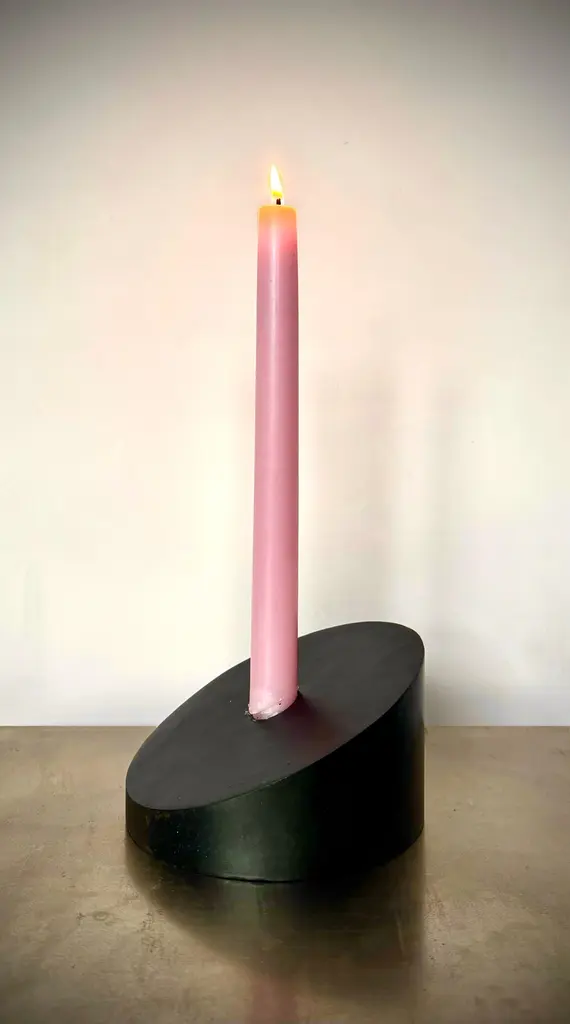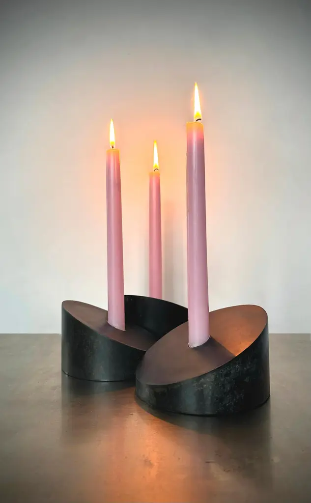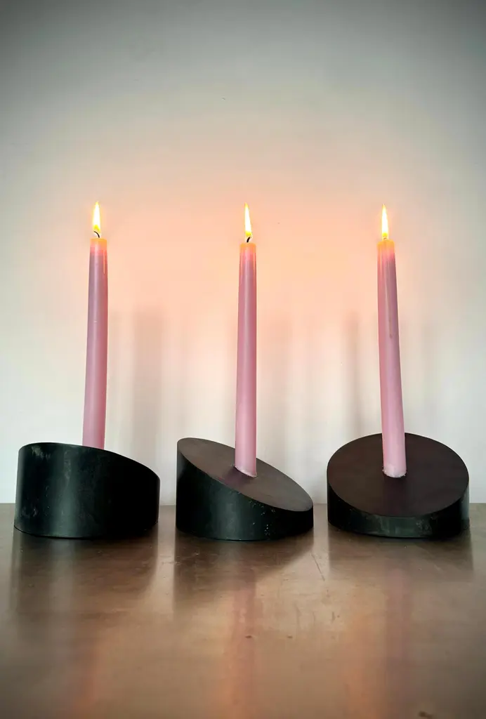 Designed and handcrafted in Brooklyn NY by artist Franco V the Povl candle holders offer endless possibilities for creative expression. Designed for customization, they combine beauty and functionality in perfect harmony. Cut from 5 5/8 Steel cylinder at a 25º angle with a seamlessly welded face that includes a 7/8" Candle cup. Arrange them as you wish. Sold individually.Inquire about customization options.In Blackened Steel5 5/8" Diameter, 3 1/4" High, 7/8" Candle Cup