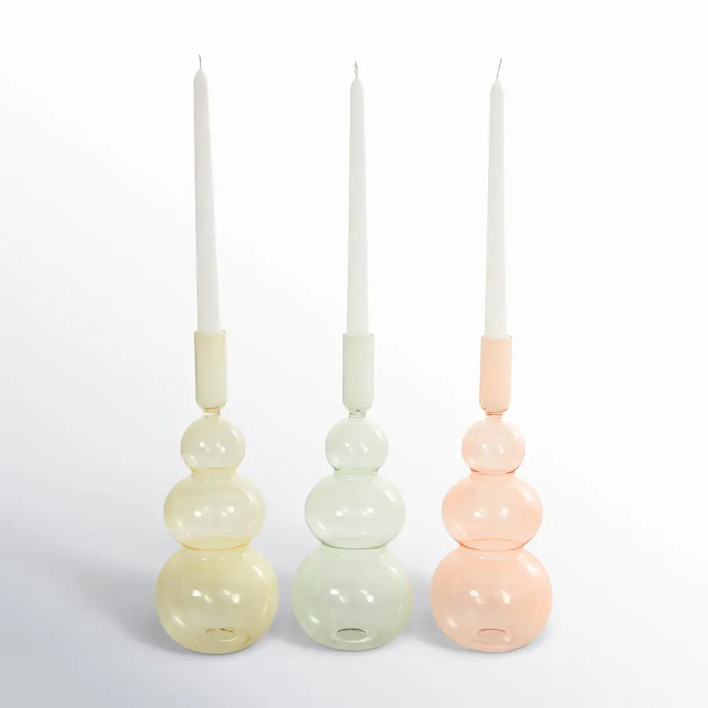 Add a touch of whimsy and romance to the table with these sculptural mouth-blown glass candlesticks in vibrant and joyful hues. Inspired by the traditional bubbly glassware from Provence in southern France, this perpetually effervescent set brings sparkle and luminescence to everyday occasions and special celebrations alike. Gift boxed. Based in Connecticut, Juliska is committed to bringing elegant European design into our modern homes. Since its founding in 2001, when David and Capucine Gooding began by working with artisans outside of Prague to reproduce antique Bohemian glass pieces, every piece from Juliska has shared a rich heritage spanning six centuries of European design. Juliska's creations are timeless, romantic and effortlessly chic.