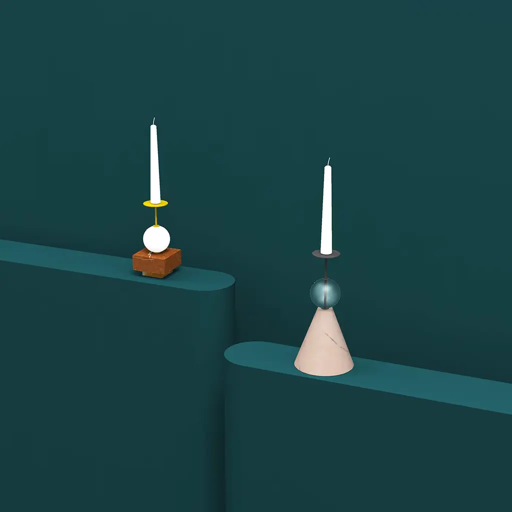 A dive into the past, this gorgeous candle draws inspiration from the designer's childhood memories of glass marbles. Showcased alone or paired to create a dynamic combination of heights and shapes, it features a white glass sphere held between an Emperador Dark and White Carrara marble base and a red-lacquered metal candlestick, completed with a clean white candle lending it an ethereal charm. Customizable in color and marble type, please ask the Concierge for options and pricing.