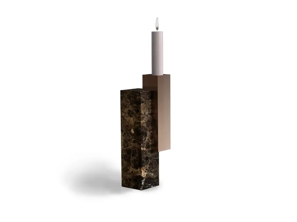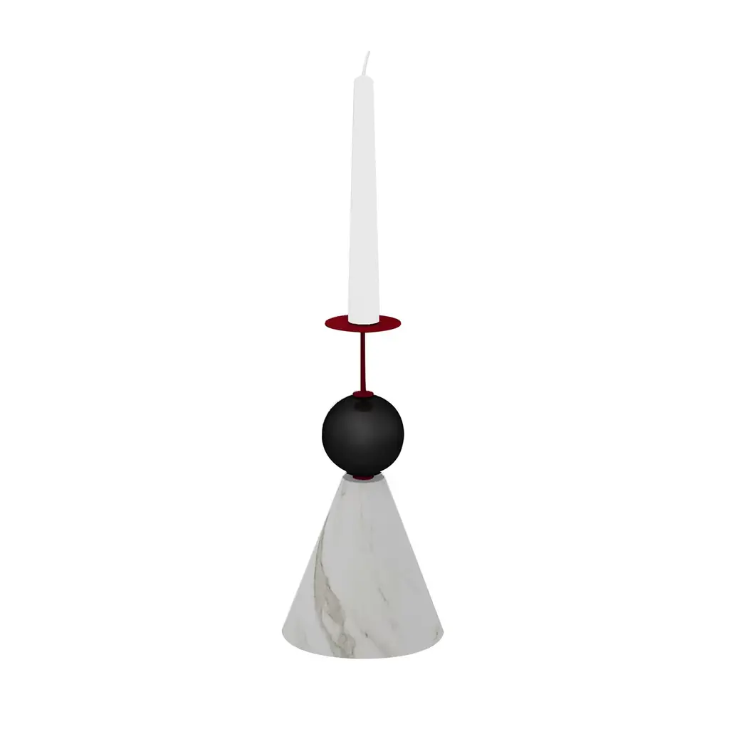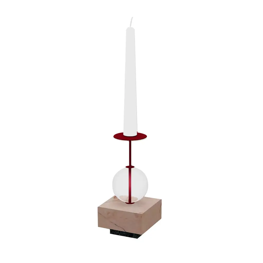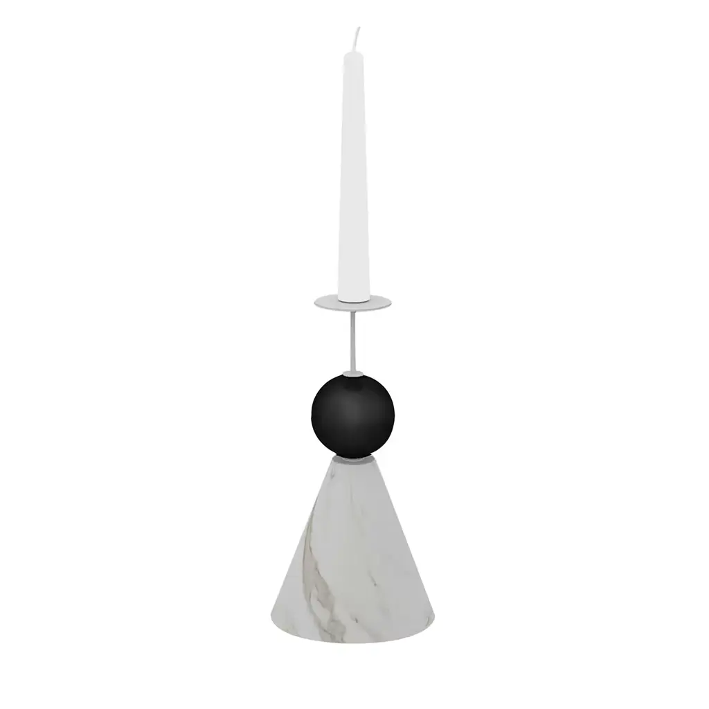 Eclectic and minimalist at the same time, this exceptional candle holder will uniquely uplift any room of a contemporary interior with its alluring, dynamic personality. Inspired by childhood memories of glass marbles, it is comprised of a sleek white glass sphere resting on an Emperador Dark marble base supported with a smaller piece of Yellow Siena marble. The candlestick is in black-lacquered metal. Please contact the Concierge for customization options and pricing.