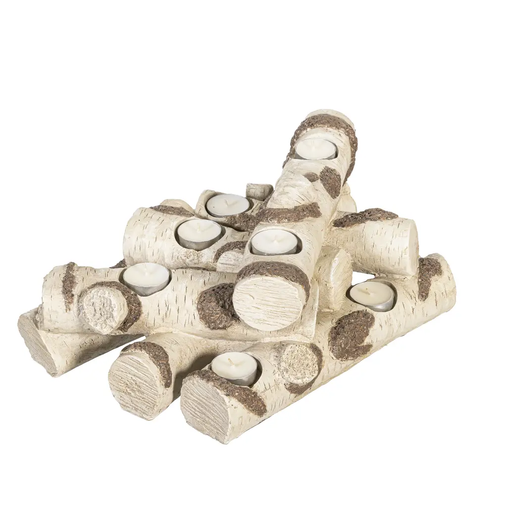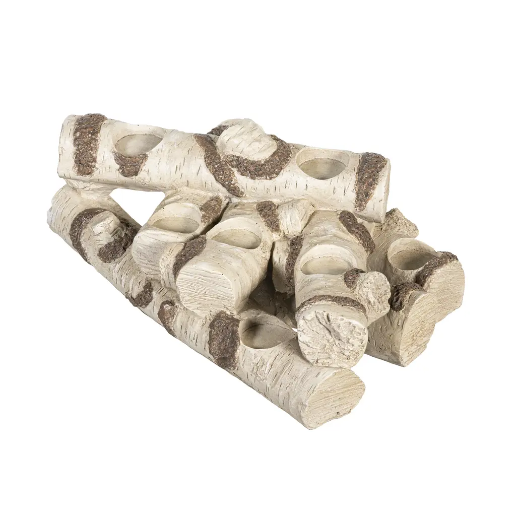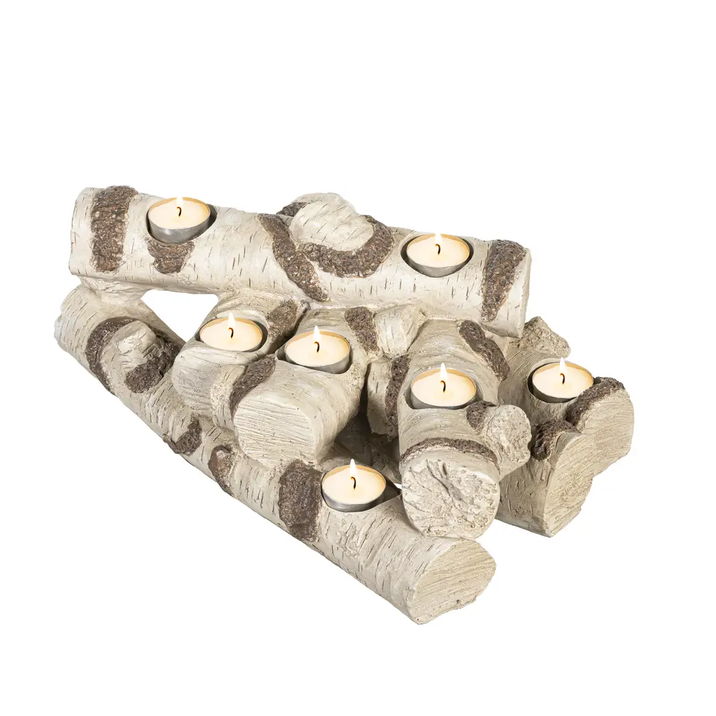 This candleabra style hearth decor features faux-wood, resin construction that ensures durability while offering the cozy ambiance of a fire without the heat or cleanup. The perfect way to adorn your hearth area when not using the fireplace. Crafted to resemble birch logs with meticulous attention to detail, this elegant piece measures 15"L x 9"W x 5"H, providing the perfect fit for your hearth.