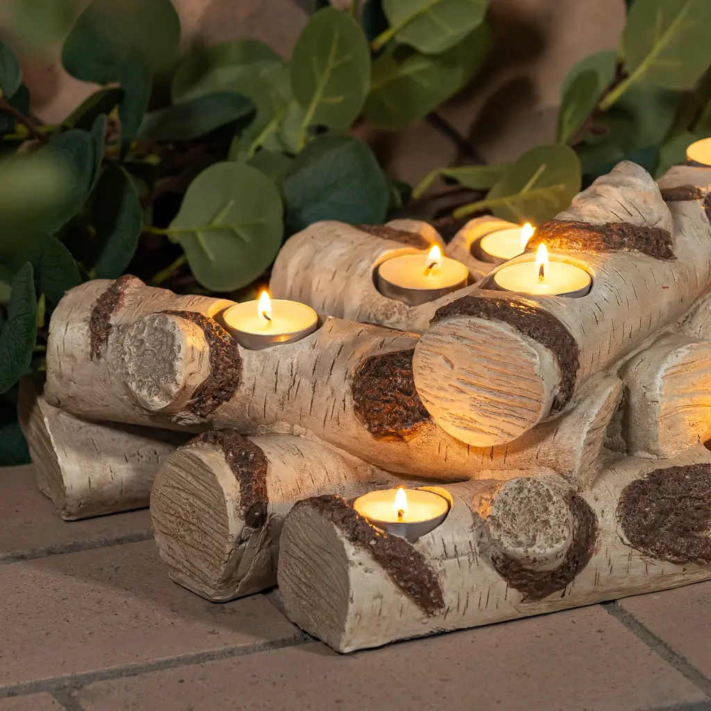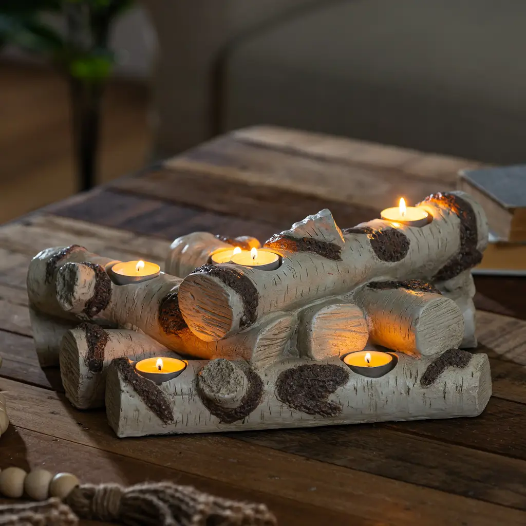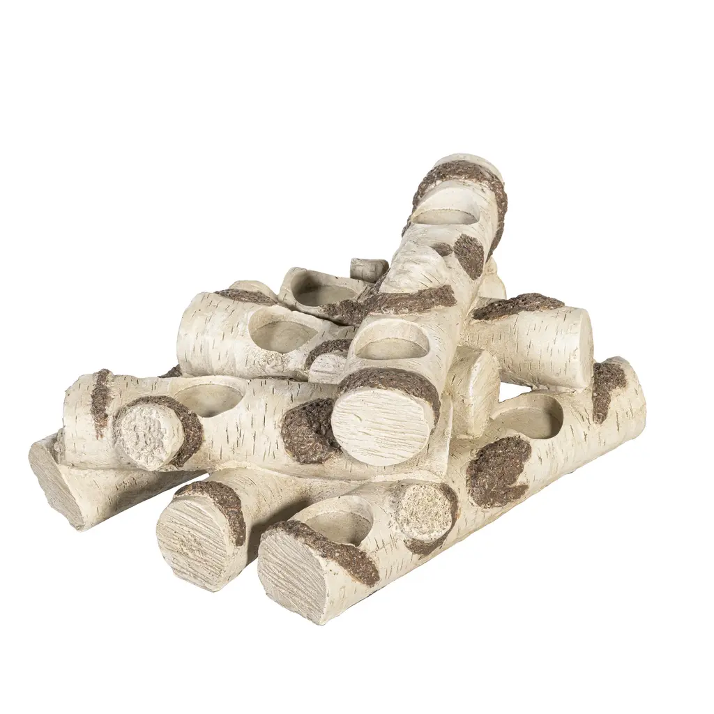 This candleabra style hearth decor features faux-wood, resin construction that ensures durability while offering the cozy ambiance of a fire without the heat or cleanup. The perfect way to adorn your hearth area when not using the fireplace. Crafted to resemble birch logs with meticulous attention to detail, this elegant piece measures 15"L x 9"W x 5"H, providing the perfect fit for your hearth.