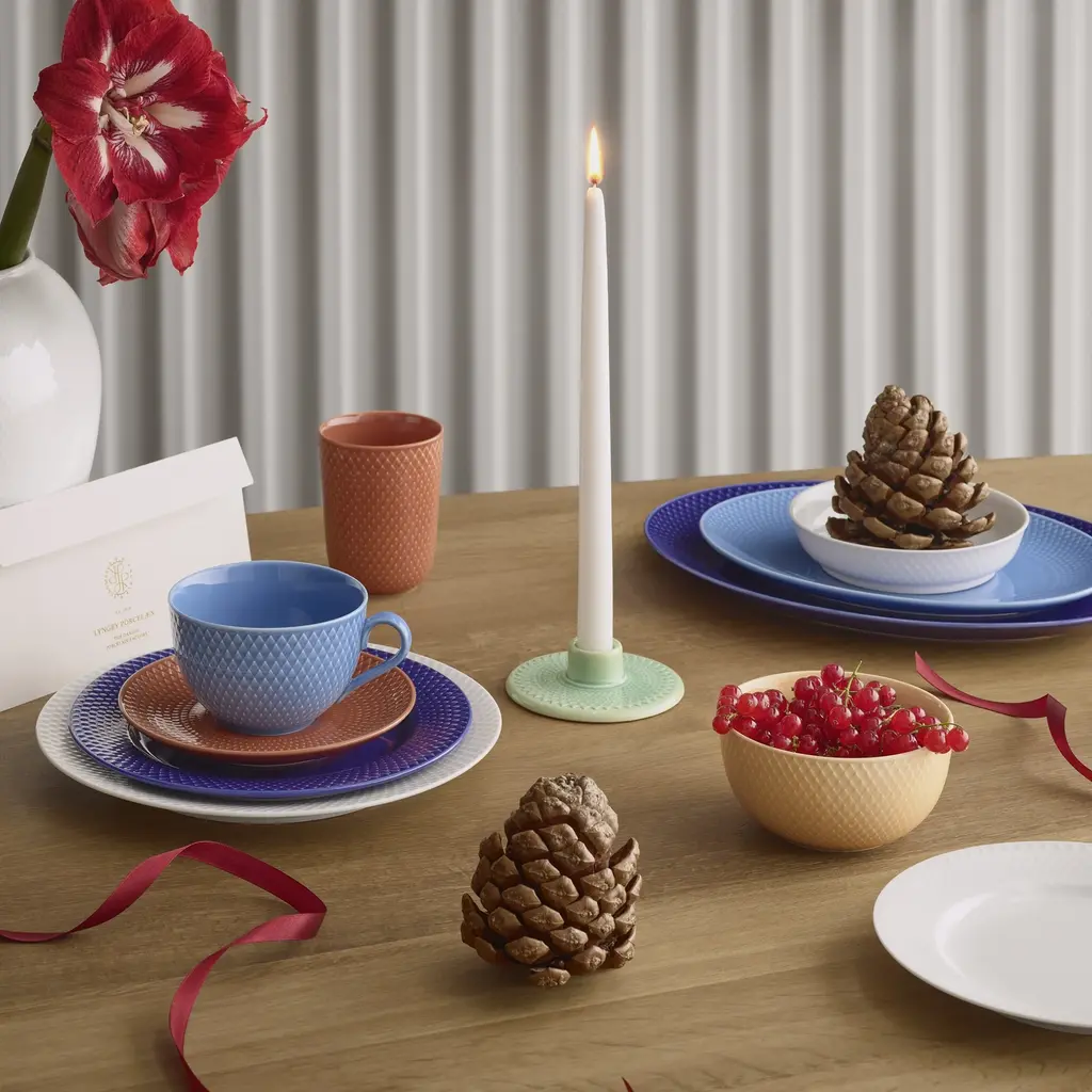 A vibrant and textural accent for any space, the Rhombe Color Candle Holder from Lyngby Porcelaen is a tribute to the brand's design archives. This porcelain candle holder features the iconic Rhombe pattern, a subtle geometric relief from the brand's archives. The delicate, three-dimensional texture emerges beautifully through the glossy glaze, adding a touch of sophisticated detail. This set of four is perfect for creating a warm, inviting atmosphere on a dining table, coffee table, or mantelpiece. Highlights: