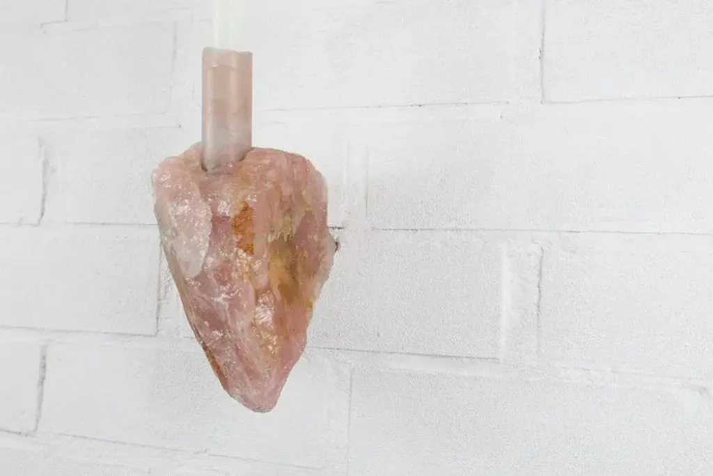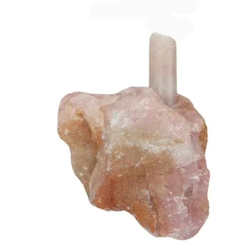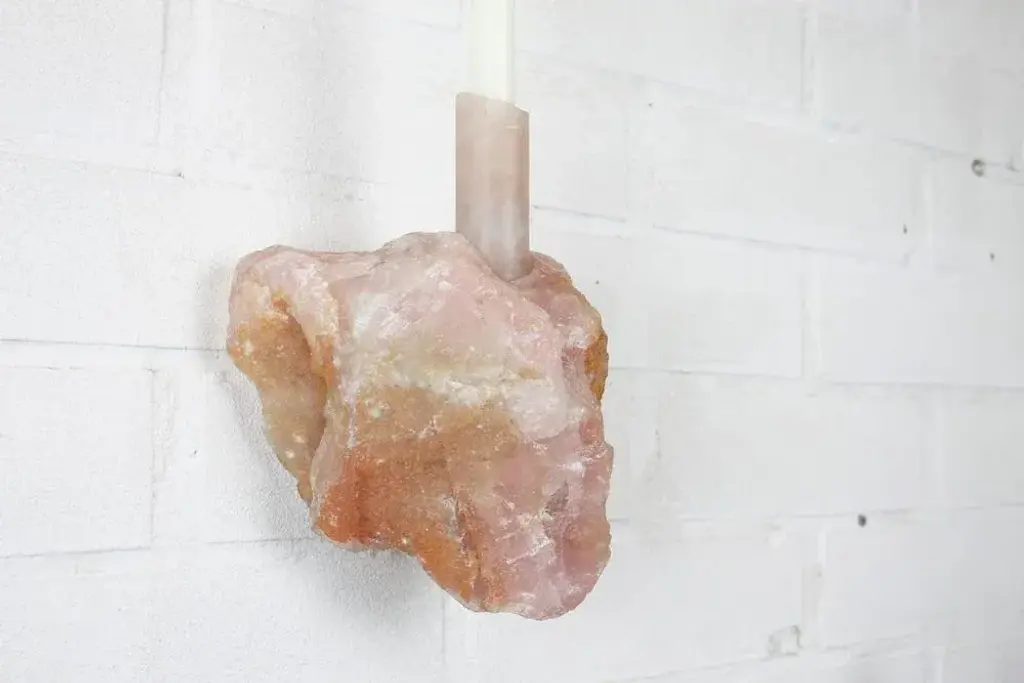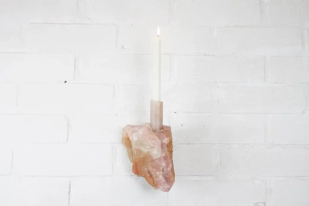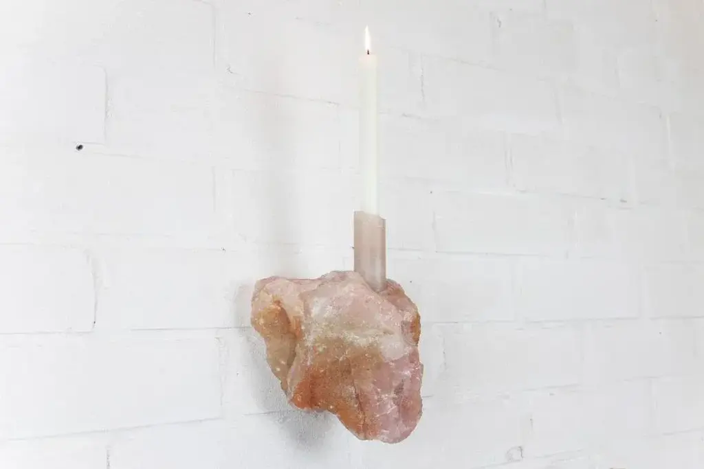 Rose quartz abra candelabra by studio do dimensions: d 16 x w 14 x h 25.5 cm materials: rose quartz, aluminum. 5.4 kg. Stone and fire are connected in an ageless bond. A sparkle created by clashing two stones with each other has been igniting fire over centuries. At the same time stones are used to safely border campfires. The warmth of the stone and intimate flame, reflect here on our interior environment. The classical shapes of candle holders are brought to light by extracting it from the core of a stone. Set in a 21st-century interpretation, it connects a timeless design type with a primitive appearing but contemporary driven technology. Based in antwerp, studio do is a stone cutting atelier founded by dana seachuga and octave vandeweghe. These two creatives work independently: dana as a jewellery maker and octave as an artist. For studio do they joined forces and share their creative visions and expertise. Driven by their affection for stone cutting, they research the material and cultural role of (gem)stones within the realm of functional objects. Using basic interventions, shapes and aesthetics, they try to search for the minimal action necessary to give a rock a (traditional) function. Studio do works on design projects and takes commissions related to stone, art, design objects and jewellery. Label & labour stand along each other as one, becoming inseparable.