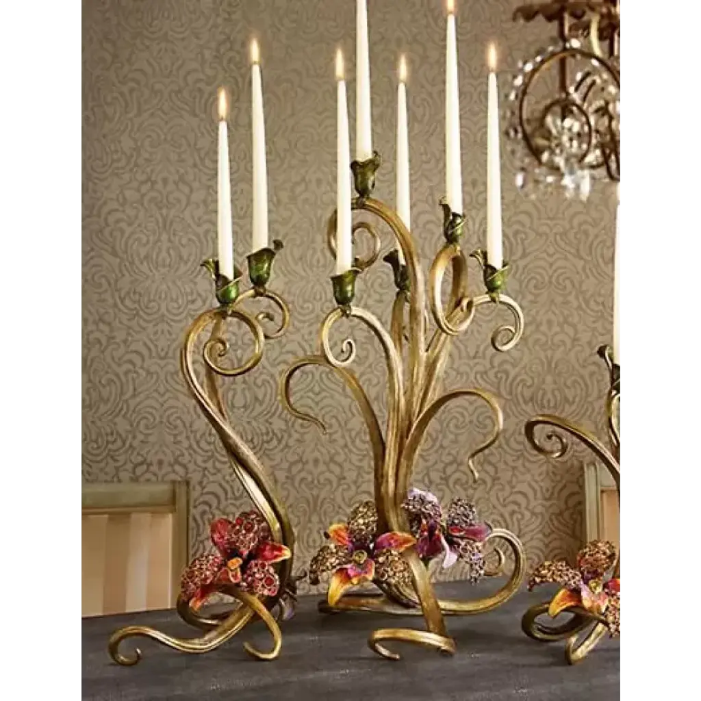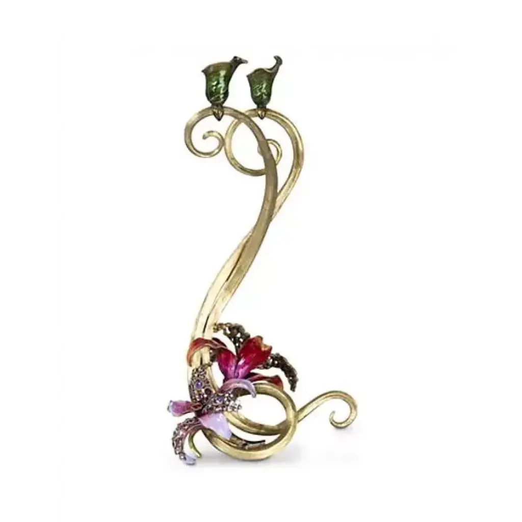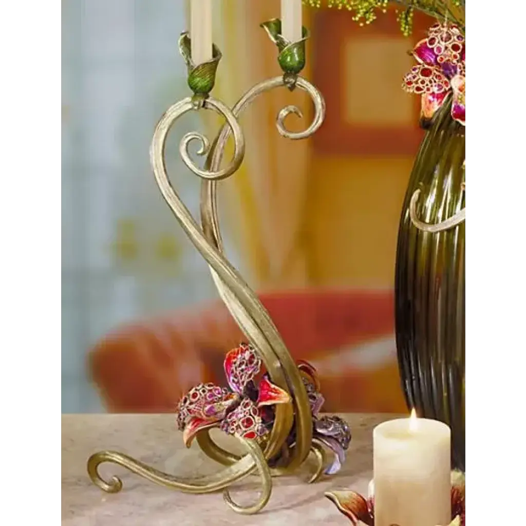 A striking contour of nouveau-style scrolled brass rises from the table, holding leaf-shaped candle cups. At the base of our Roselyn Orchid Double Candlestick, lush orchids are fully bloomed in hothouse-toned enamels and set with vibrant faceted crystals and stones. Beautiful displayed as a pair or individually.